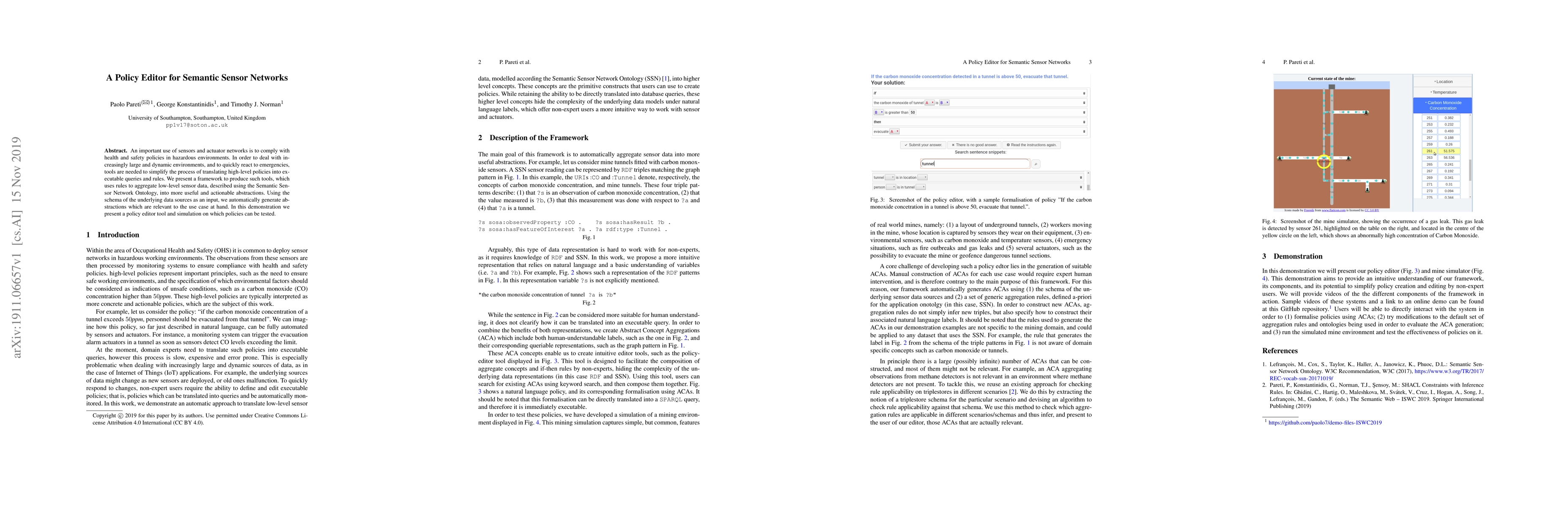 An important use of sensors and actuator networks is to comply with health and safety policies in hazardous environments. In order to deal with increasingly large and dynamic environments, and to quickly react to emergencies, tools are needed to simplify the process of translating high-level policies into executable queries and rules. We present a framework to produce such tools, which uses rules to aggregate low-level sensor data, described using the Semantic Sensor Network Ontology, into more useful and actionable abstractions. Using the schema of the underlying data sources as an input, we automatically generate abstractions which are relevant to the use case at hand. In this demonstration we present a policy editor tool and a simulation on which policies can be tested.
