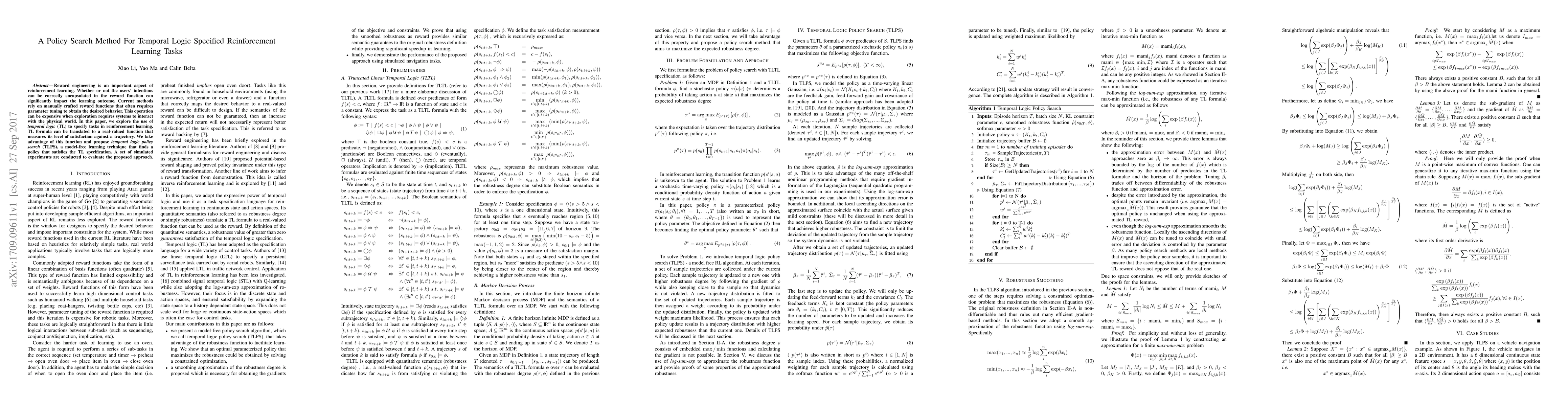 This paper introduces temporal logic policy search (TLPS), a model-free reinforcement learning method that uses temporal logic specifications to guide policy search, eliminating the need for manually crafted reward functions and reducing the cost of exploration in physical environments. The effectiveness of TLPS is demonstrated through simulated experiments.
