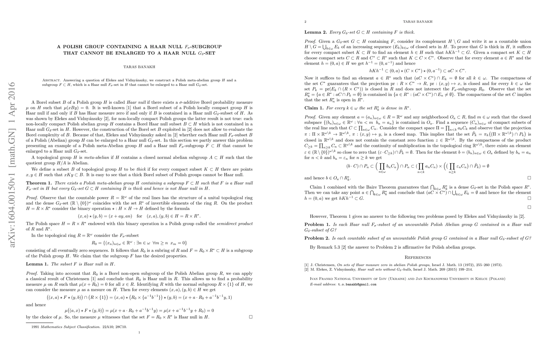 This paper constructs a Polish meta-abelian group $H$ and a subgroup $F$ that is a Haar null $F_\sigma$-set in $H$, demonstrating that $F$ cannot be enlarged to a Haar null $G_\delta$-set, answering a question posed by Elekes and Vidny\'anszky.