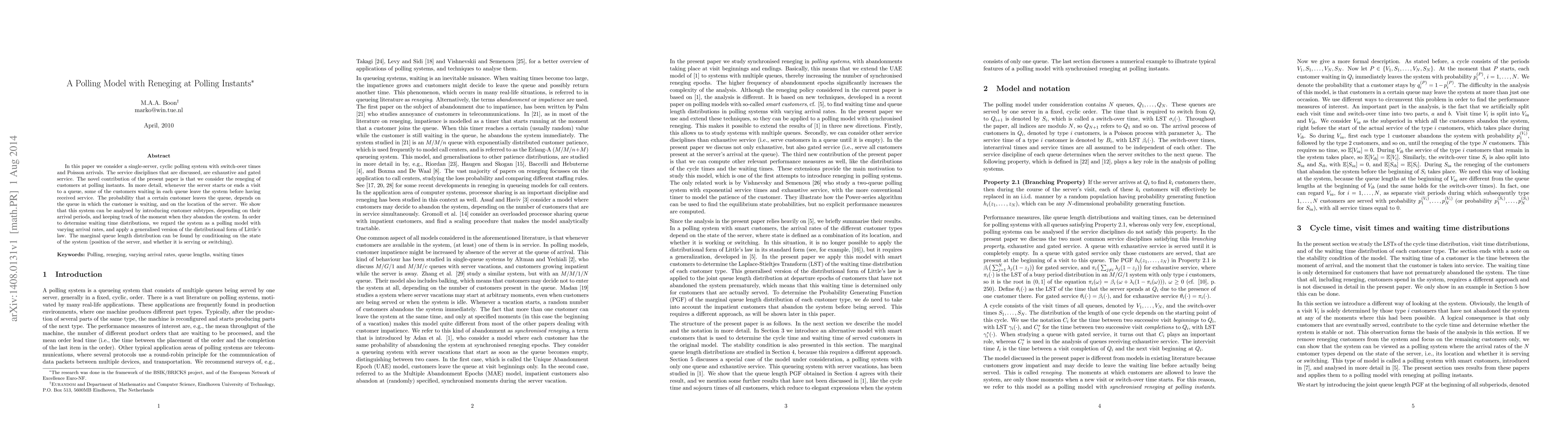 This paper examines a cyclic polling system with Poisson arrivals, switch-over times, and exhaustive or gated service disciplines, focusing on customer reneging at polling instants. It introduces customer subtypes and varying arrival rates to analyze waiting time distributions and marginal queue length, employing a generalized version of Little's law.