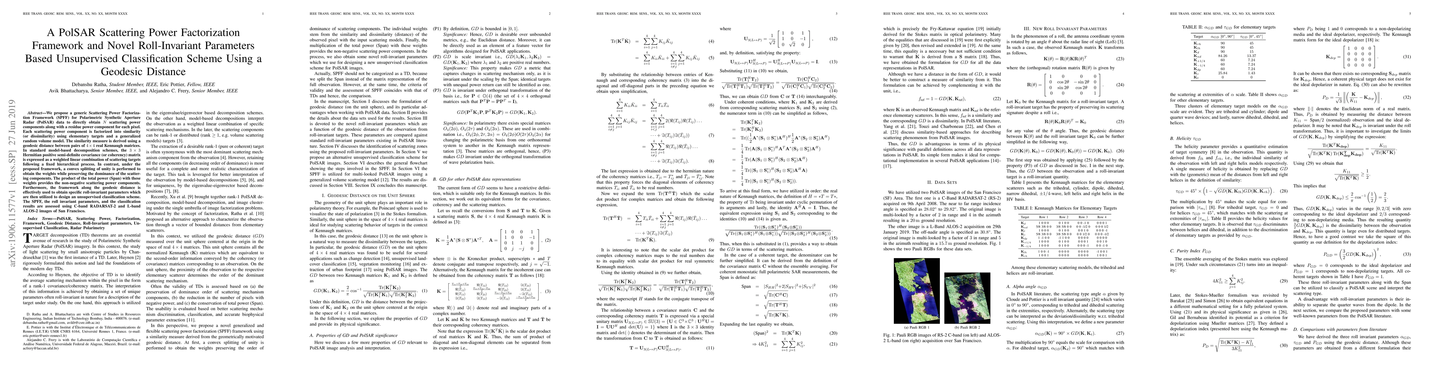 This paper proposes a Scattering Power Factorization Framework (SPFF) for PolSAR data to extract scattering power components and a residue, factorizing them using geodesic distances on Kennaugh matrices. It also introduces roll-invariant parameters and an unsupervised classification scheme based on these parameters, evaluated on C-band and L-band satellite images.
