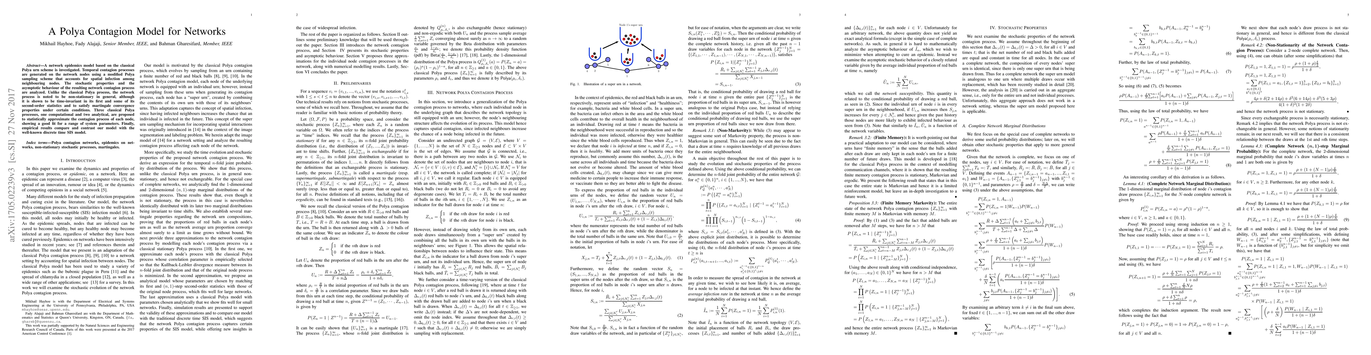 A network epidemics model based on the classical Polya urn scheme is investigated. Temporal contagion processes are generated on the network nodes using a modified Polya sampling scheme that accounts for spatial infection among neighbouring nodes. The stochastic properties and the asymptotic behaviour of the resulting network contagion process are analyzed. Unlike the classical Polya process, the network process is noted to be non-stationary in general, although it is shown to be time-invariant in its first and some of its second-order statistics and to satisfy martingale convergence properties under certain conditions. Three classical Polya processes, one computational and two analytical, are proposed to statistically approximate the contagion process of each node, showing a good fit for a range of system parameters. Finally, empirical results compare and contrast our model with the well-known discrete time SIS model.