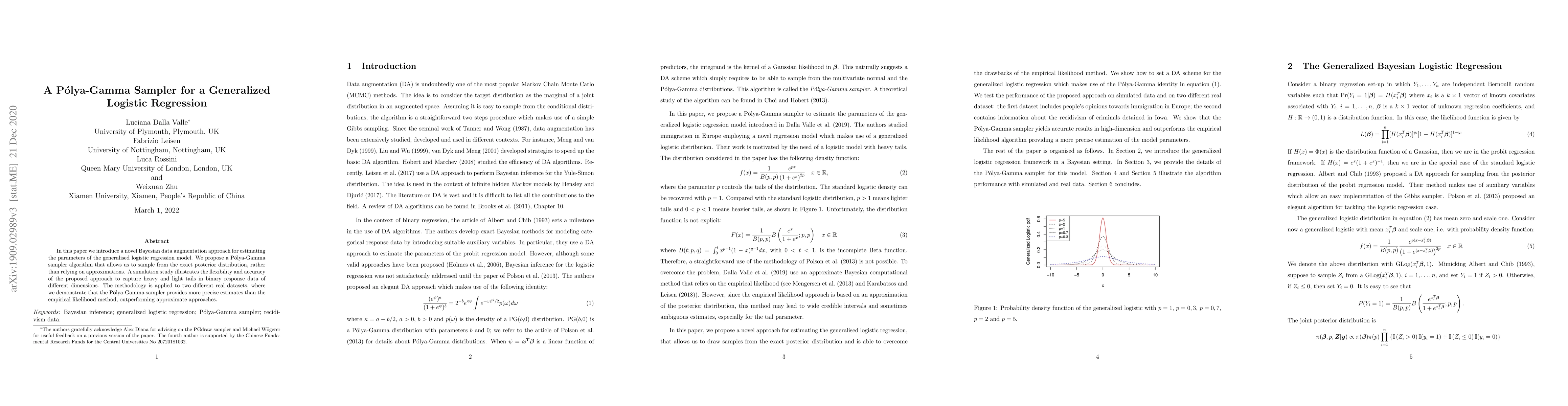 This paper introduces a P\'olya-Gamma sampler for Bayesian data augmentation in generalized logistic regression, enabling exact posterior sampling. The proposed method is shown to be more precise than empirical likelihood and approximate methods in both simulation and real-world datasets.
