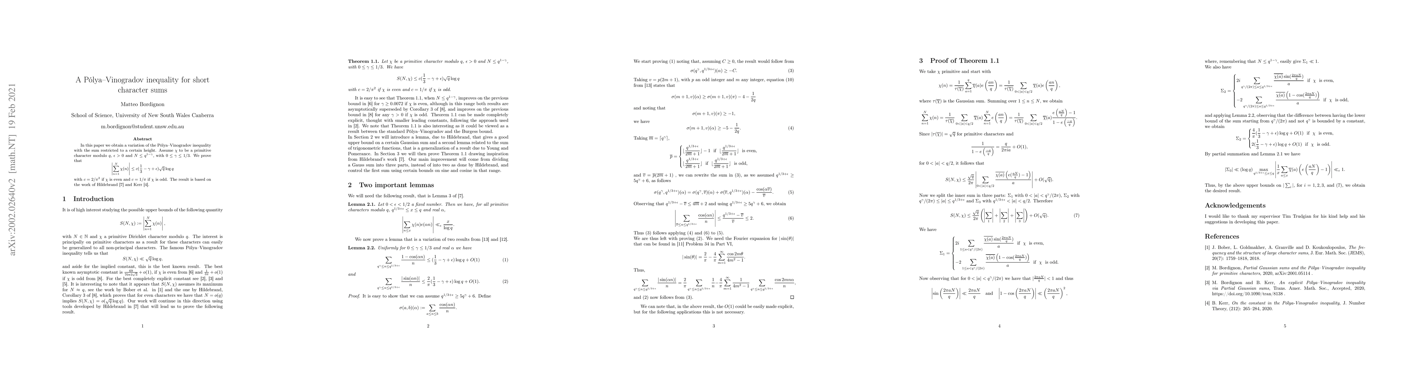 This paper establishes a refined Pólya-Vinogradov inequality for short character sums, where the sum is restricted to a height $N \le q^{1-\gamma}$ with $0 \le \gamma \le 1/3$. The result provides bounds on the size of the sum involving a primitive character modulo $q$, with specific constants depending on whether the character is even or odd.