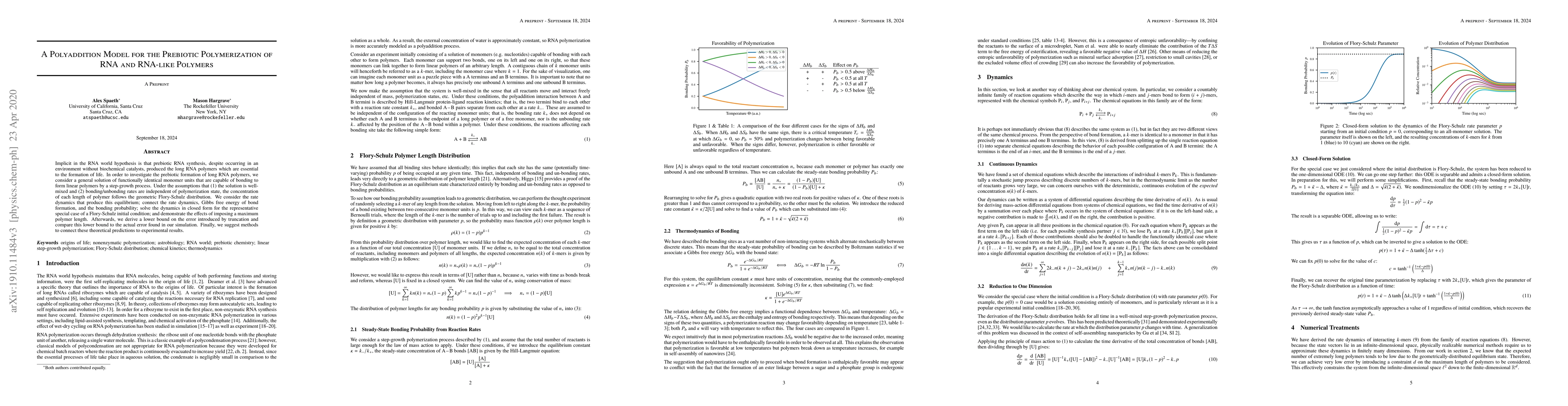 This paper develops a polyaddition model to explore the prebiotic synthesis of long RNA polymers, showing that under certain conditions, the geometric Flory-Schulz distribution describes polymer length concentrations. It also investigates the effects of polymer length truncation and proposes methods to link theoretical predictions with experimental data.