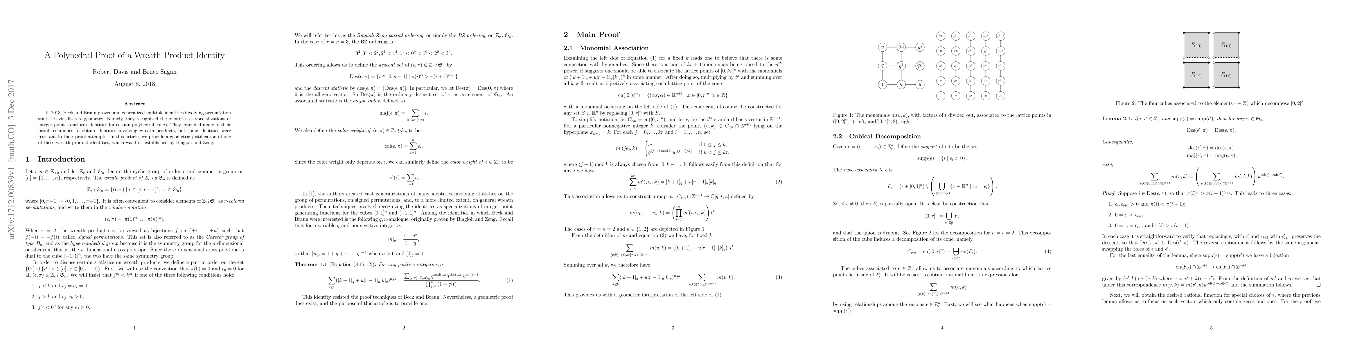 In 2013, Beck and Braun proved and generalized multiple identities involving permutation statistics via discrete geometry. Namely, they recognized the identities as specializations of integer point transform identities for certain polyhedral cones. They extended many of their proof techniques to obtain identities involving wreath products, but some identities were resistant to their proof attempts. In this article, we provide a geometric justification of one of these wreath product identities, which was first established by Biagioli and Zeng.