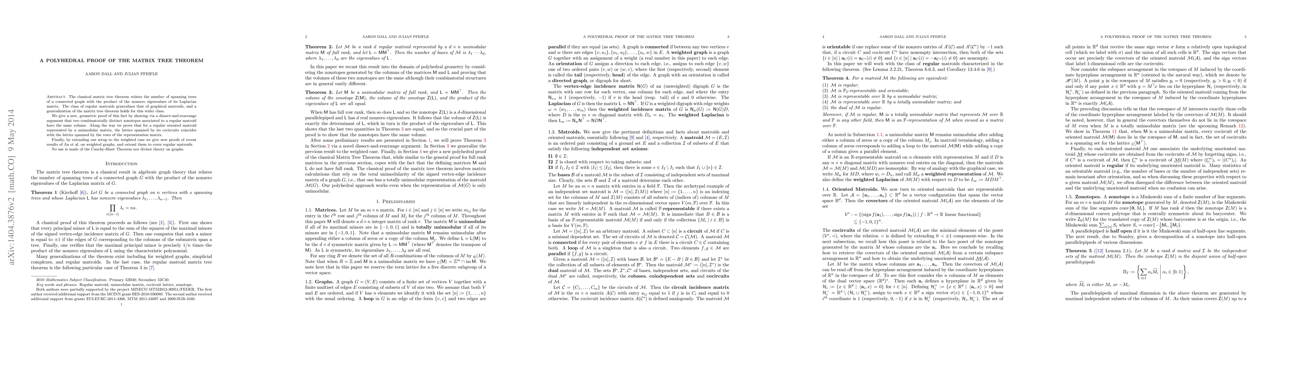 This paper presents a polyhedral proof of the matrix tree theorem for regular matroids, showing that two combinatorially distinct zonotopes associated with such matroids have the same volume. It also establishes that the lattice of cocircuits coincides with the lattice of representation matrix rows for regular oriented matroids.