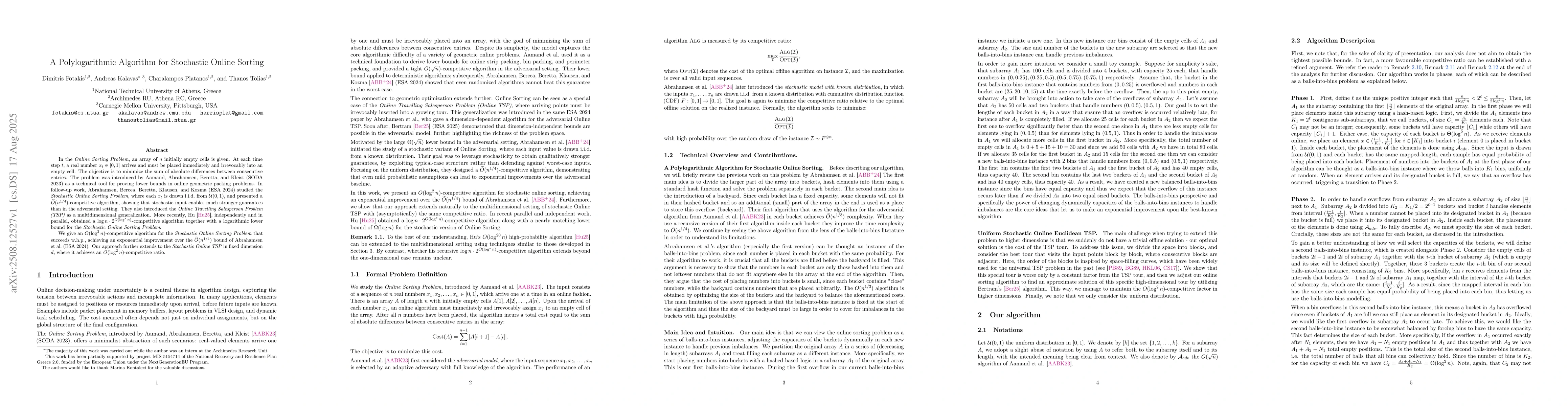 In the \emph{Online Sorting Problem}, an array of $n$ initially empty cells is given. At each time step $t$, a real number $x_t \in [0,1]$ arrives and must be placed immediately and irrevocably into an empty cell. The objective is to minimize the sum of absolute differences between consecutive entries. The problem was introduced by Aamand, Abrahamsen, Beretta, and Kleist (SODA 2023) as a technical tool for proving lower bounds in online geometric packing problems. In follow-up work, Abrahamsen, Bercea, Beretta, Klausen, and Kozma (ESA 2024) studied the \emph{Stochastic Online Sorting Problem}, where each $x_t$ is drawn i.i.d.\ from $\mathcal{U}(0,1)$, and presented a $\widetilde{O}(n^{1/4})$-competitive algorithm, showing that stochastic input enables much stronger guarantees than in the adversarial setting. They also introduced the \emph{Online Travelling Salesperson Problem (TSP)} as a multidimensional generalization. More recently, Hu, independently and in parallel, obtained a $\log n \cdot 2^{O(\log^* n)}$-competitive algorithm together with a logarithmic lower bound for the \emph{Stochastic Online Sorting Problem}. We give an $O(\log^{2} n)$-competitive algorithm for the \emph{Stochastic Online Sorting Problem} that succeeds w.h.p., achieving an exponential improvement over the $\widetilde{O}(n^{1/4})$ bound of Abrahamsen et al.(ESA 2024). Our approach further extends to the \emph{Stochastic Online TSP} in fixed dimension $d$, where it achieves an $O(\log^2 n)$-competitive ratio.