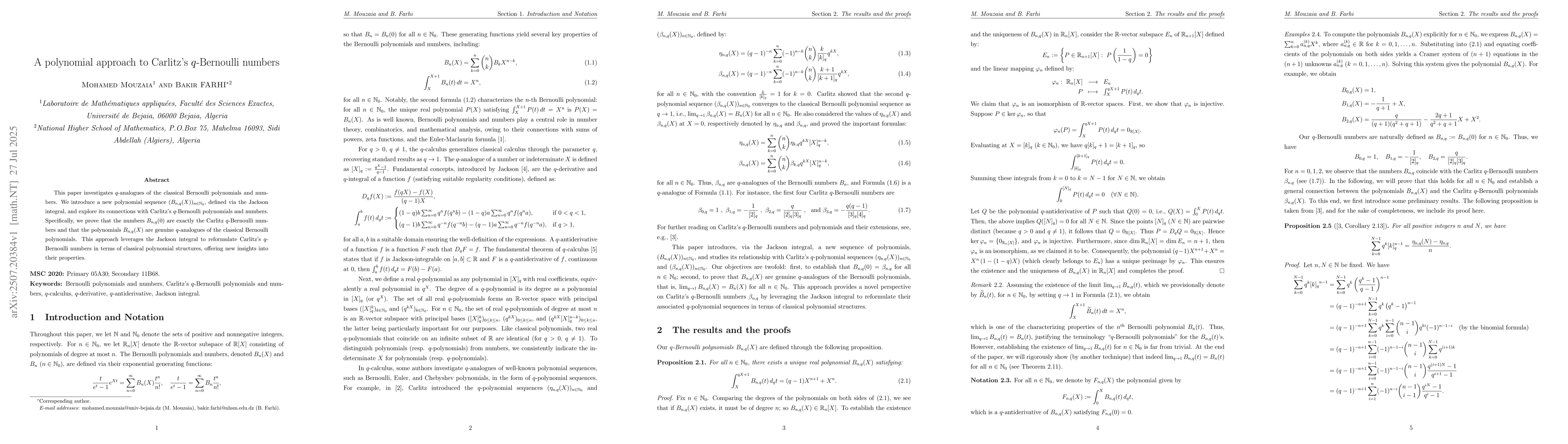 This paper investigates $q$-analogues of the classical Bernoulli polynomials and numbers. We introduce a new polynomial sequence ${\left(B_{n , q}(X)\right)}_{n \in \mathbb{N}_0}$, defined via the Jackson integral, and explore its connections with Carlitz's $q$-Bernoulli polynomials and numbers. Specifically, we prove that the numbers $B_{n , q}(0)$ are exactly the Carlitz $q$-Bernoulli numbers and that the polynomials $B_{n , q}(X)$ are genuine $q$-analogues of the classical Bernoulli polynomials. This approach leverages the Jackson integral to reformulate Carlitz's $q$-Bernoulli numbers in terms of classical polynomial structures, offering new insights into their properties.