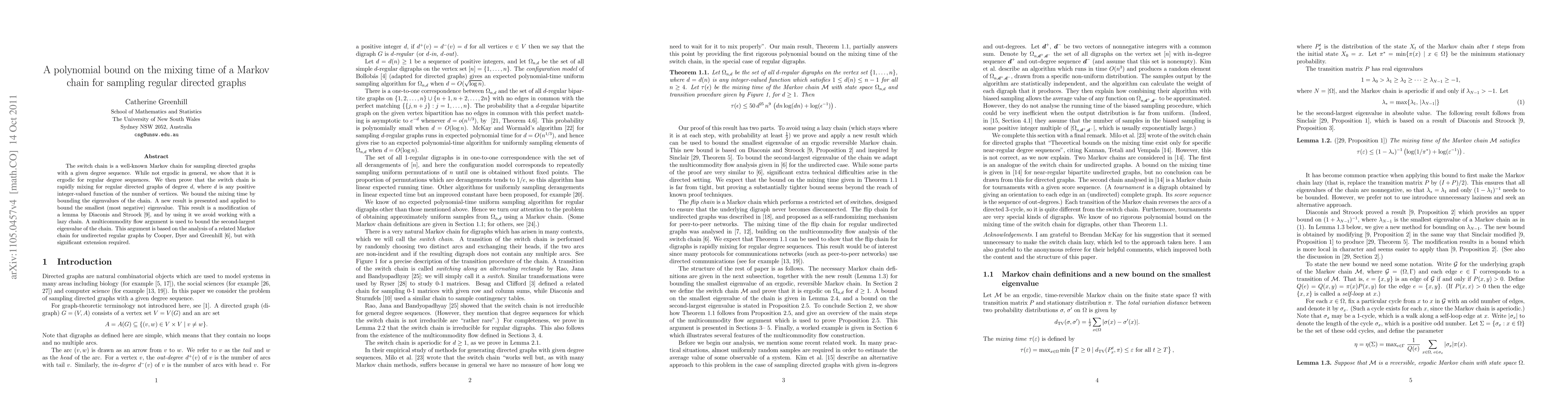 This paper demonstrates the ergodicity of the switch chain for sampling regular directed graphs and proves its rapid mixing. It introduces polynomial bounds on the mixing time by analyzing the eigenvalues of the chain, utilizing a modified lemma by Diaconis and Stroock and a multicommodity flow argument to achieve these bounds.