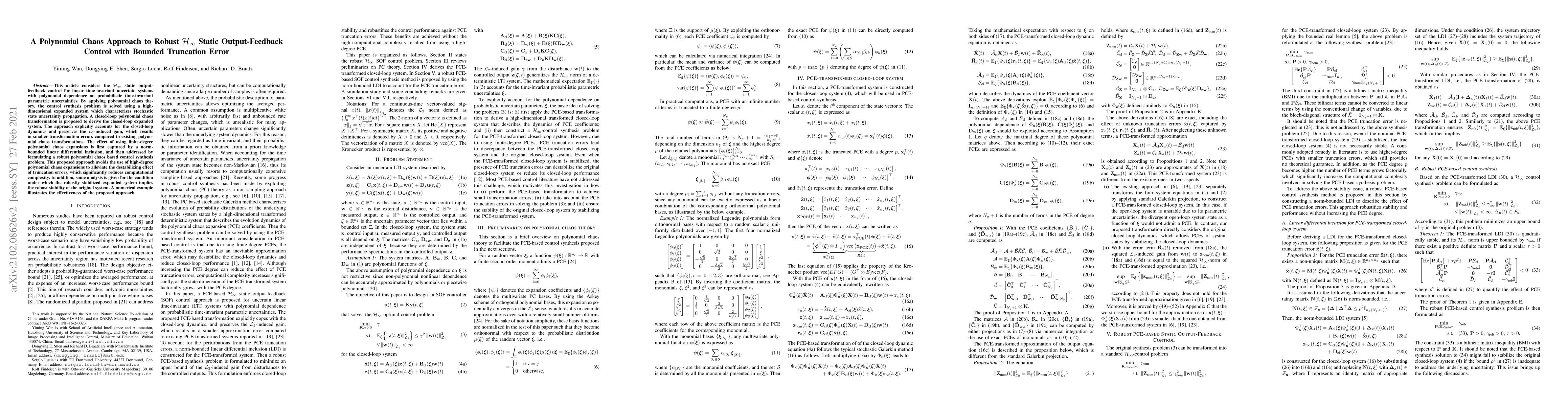 This article considers the $\mathcal{H}_\infty$ static output-feedback control for linear time-invariant uncertain systems with polynomial dependence on probabilistic time-invariant parametric uncertainties. By applying polynomial chaos theory, the control synthesis problem is solved using a high-dimensional expanded system which characterizes stochastic state uncertainty propagation. A closed-loop polynomial chaos transformation is proposed to derive the closed-loop expanded system. The approach explicitly accounts for the closed-loop dynamics and preserves the $\mathcal{L}_2$-induced gain, which results in smaller transformation errors compared to existing polynomial chaos transformations. The effect of using finite-degree polynomial chaos expansions is first captured by a norm-bounded linear differential inclusion, and then addressed by formulating a robust polynomial chaos based control synthesis problem. This proposed approach avoids the use of high-degree polynomial chaos expansions to alleviate the destabilizing effect of truncation errors, which significantly reduces computational complexity. In addition, some analysis is given for the condition under which the robustly stabilized expanded system implies the robust stability of the original system. A numerical example illustrates the effectiveness of the proposed approach.