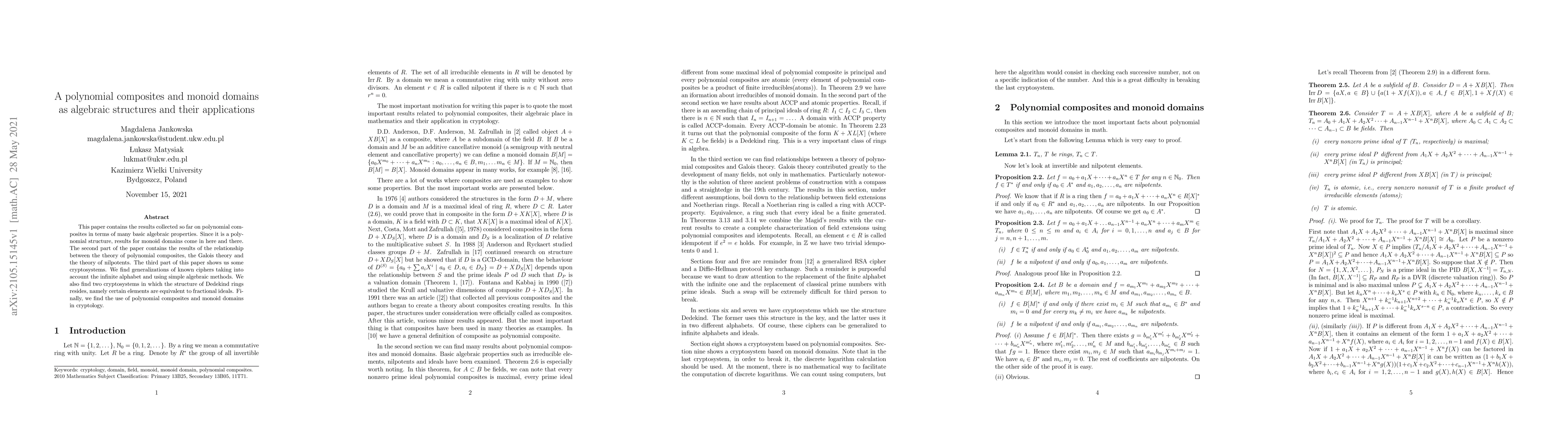 This paper contains the results collected so far on polynomial composites in terms of many basic algebraic properties. Since it is a polynomial structure, results for monoid domains come in here and there. The second part of the paper contains the results of the relationship between the theory of polynomial composites, the Galois theory and the theory of nilpotents. The third part of this paper shows us some cryptosystems. We find generalizations of known ciphers taking into account the infinite alphabet and using simple algebraic methods. We also find two cryptosystems in which the structure of Dedekind rings resides, namely certain elements are equivalent to fractional ideals. Finally, we find the use of polynomial composites and monoid domains in cryptology.