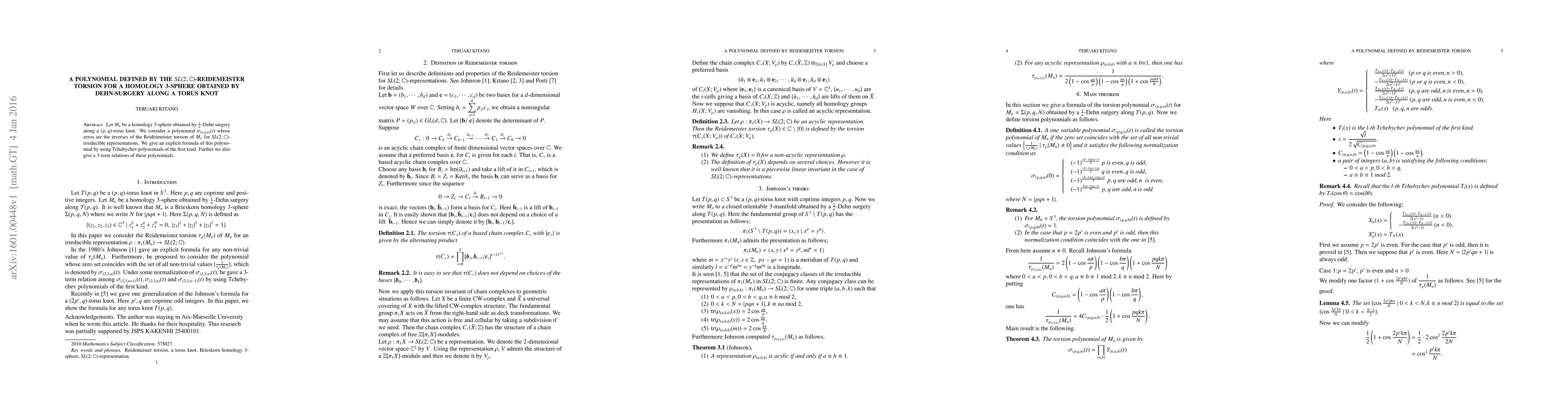 This paper defines a polynomial $\sigma_{(p,q,n)}(t)$ associated with the $\mathit{SL}(2;\mathbb{C})$-Reidemeister torsion for a homology 3-sphere $M_n$ obtained via $\frac1n$-Dehn surgery along a $(p,q)$-torus knot. The authors provide an explicit formula for this polynomial using Tchebychev polynomials of the first kind and establish a 3-term relation among these polynomials.