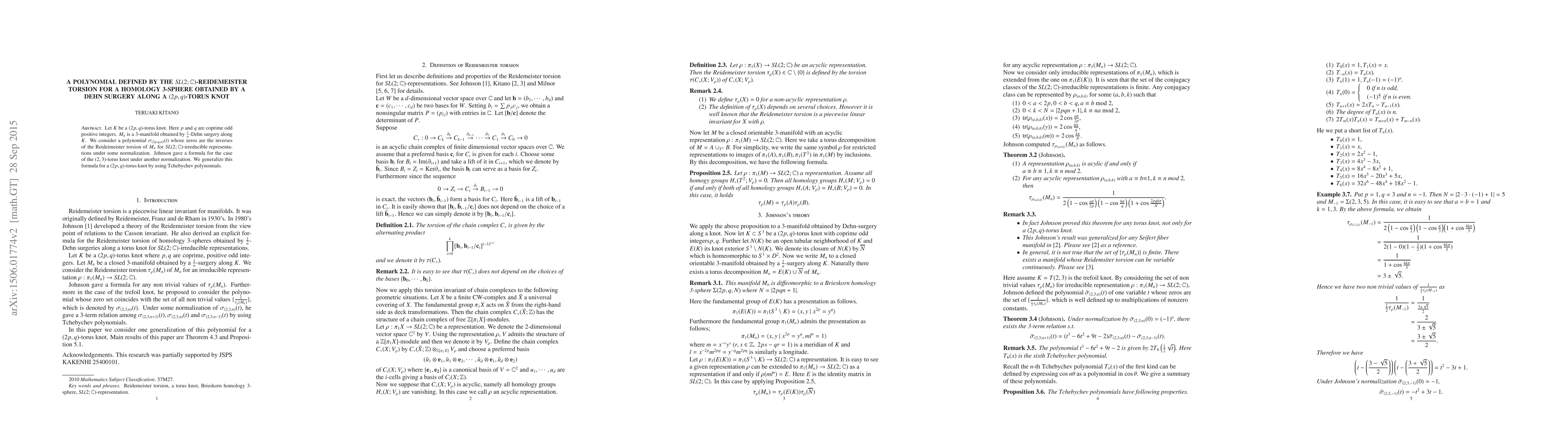 This paper generalizes Johnson's formula for the SL(2;C)-Reidemeister torsion of 3-manifolds obtained by Dehn surgery along a (2p,q)-torus knot, employing Tchebychev polynomials to extend the polynomial whose zeros correspond to the inverses of the torsion values.