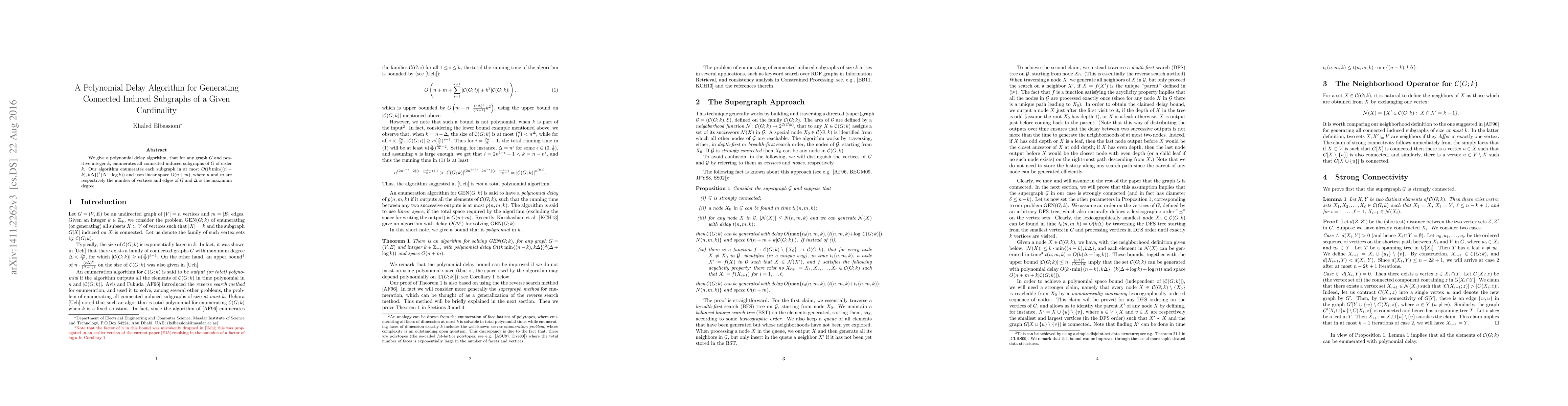 This paper presents a polynomial delay algorithm that enumerates all connected induced subgraphs of a given order $k$ in a graph $G$, with each subgraph enumerated in $O((k\min\{(n-k),k\Delta\})^2(\Delta+\log k))$ time and using linear space $O(n+m)$.