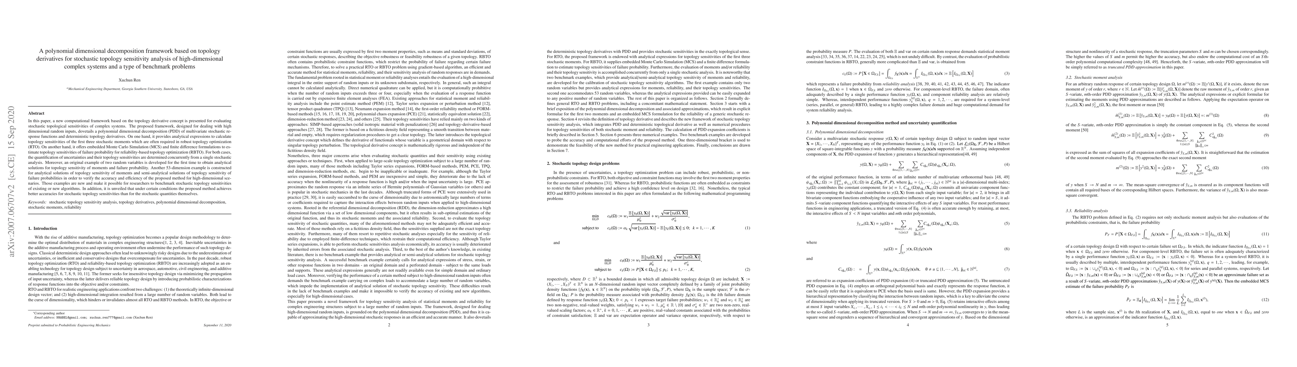 In this paper, a new computational framework based on the topology derivative concept is presented for evaluating stochastic topological sensitivities of complex systems. The proposed framework, designed for dealing with high dimensional random inputs, dovetails a polynomial dimensional decomposition (PDD) of multivariate stochastic response functions and deterministic topology derivatives. On one hand, it provides analytical expressions to calculate topology sensitivities of the first three stochastic moments which are often required in robust topology optimization (RTO). On another hand, it offers embedded Monte Carlo Simulation (MCS) and finite difference formulations to estimate topology sensitivities of failure probability for reliability-based topology optimization (RBTO). For both cases, the quantification of uncertainties and their topology sensitivities are determined concurrently from a single stochastic analysis. Moreover, an original example of two random variables is developed for the first time to obtain analytical solutions for topology sensitivity of moments and failure probability. Another 53-dimension example is constructed for analytical solutions of topology sensitivity of moments and semi-analytical solutions of topology sensitivity of failure probabilities in order to verify the accuracy and efficiency of the proposed method for high-dimensional scenarios. Those examples are new and make it possible for researchers to benchmark stochastic topology sensitivities of existing or new algorithms. In addition, it is unveiled that under certain conditions the proposed method achieves better accuracies for stochastic topology sensitivities than for the stochastic quantities themselves.
