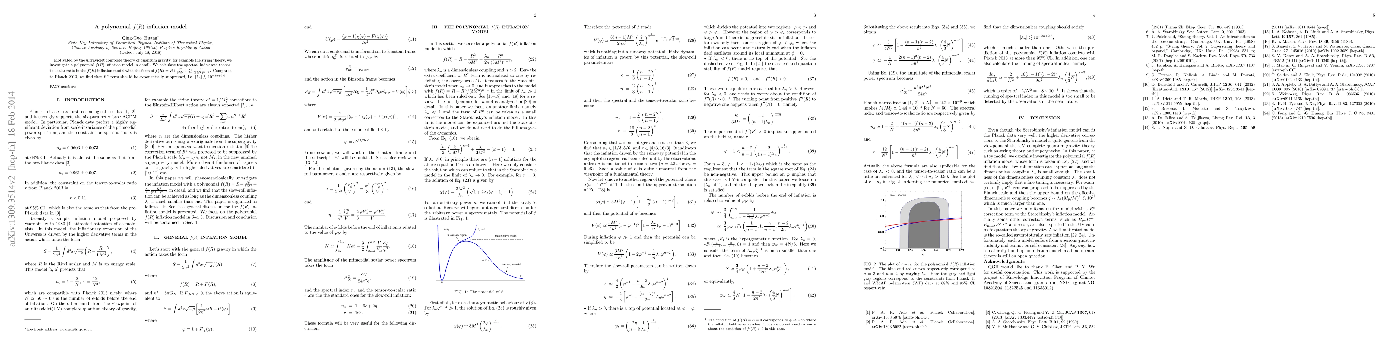 Motivated by the ultraviolet complete theory of quantum gravity, for example the string theory, we investigate a polynomial $f(R )$ inflation model in detail. We calculate the spectral index and tensor-to-scalar ratio in the $f(R )$ inflation model with the form of $f(R )=R+{R^2\over 6M^2}+{\lambda_n\over 2n}{R^n\over (3M^2)^{n-1}}$. Compared to Planck 2013, we find that $R^n$ term should be exponentially suppressed, i.e. $|\lambda_n|\lesssim 10^{-2n+2.6}$.