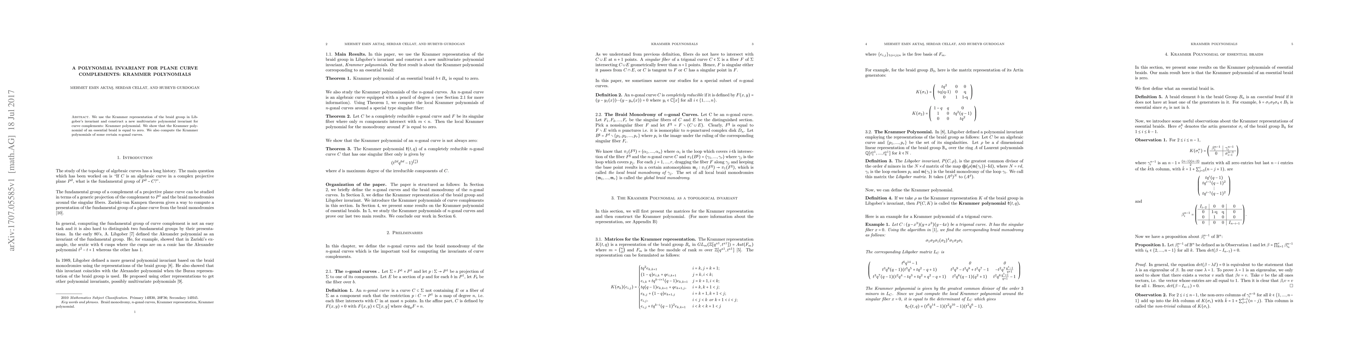 We use the Krammer representation of the braid group in Libgober's invariant and construct a new multivariate polynomial invariant for curve complements: Krammer polynomial. We show that the Krammer polynomial of an essential braid is equal to zero. We also compute the Krammer polynomials of some certain n-gonal curves.
