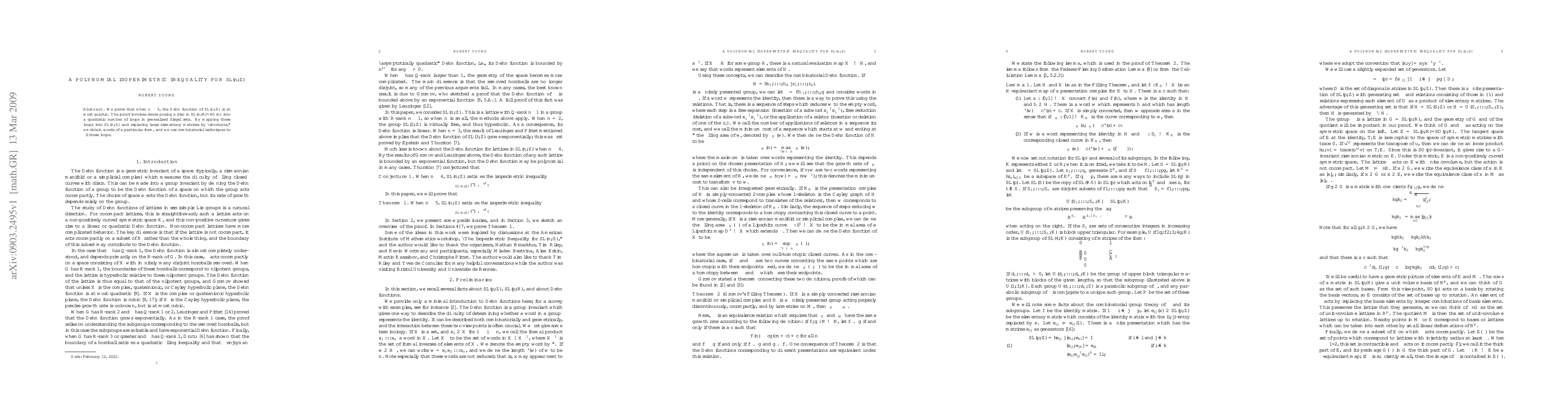 This paper proves that for n ≥ 5, the Dehn function of SL(n,Z) is quartic. It achieves this by decomposing a disc in SL(n,R)/SO(n) into a quadratic number of loops in generalized Siegel sets and using combinatorial techniques to fill these loops.