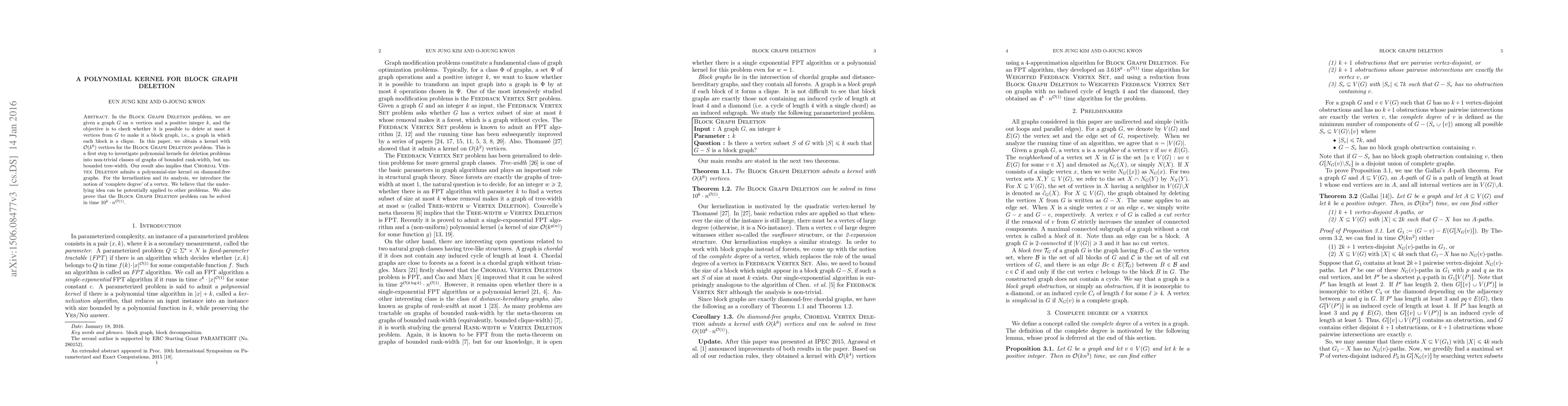 This paper presents a polynomial kernel with $\mathcal{O}(k^{6})$ vertices for the Block Graph Deletion problem, introducing the concept of `complete degree' of a vertex. It also proves that the problem can be solved in $10^{k}\cdot n^{\mathcal{O}(1)}$ time and suggests potential broader applications for the developed techniques.