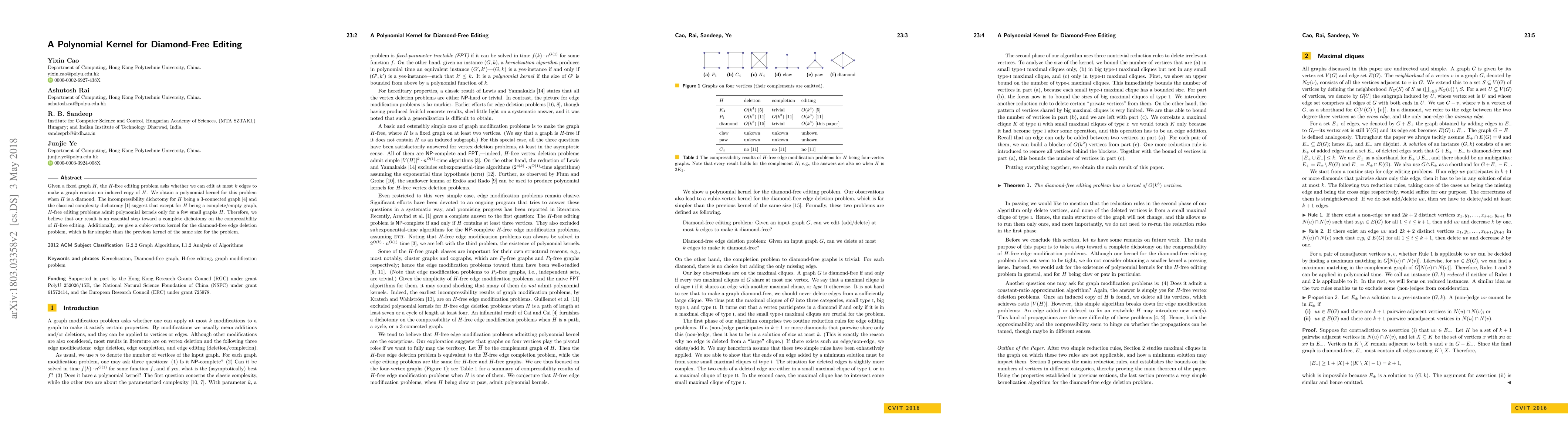 An $H$-free editing problem asks whether we can edit at most $k$ edges to make a graph contain no induced copy of the fixed graph $H$. We obtain a polynomial kernel for this problem when $H$ is a diamond. The incompressibility dichotomy for $H$ being a 3-connected graph and the classical complexity dichotomy suggest that except for $H$ being a complete/empty graph, $H$-free editing problems admit polynomial kernels only for a few small graphs $H$. Therefore, we believe that our result is an essential step toward a complete dichotomy on the compressibility of $H$-free editing. Additionally, we give a cubic-vertex kernel for the diamond-free edge deletion problem, which is far simpler than the previous kernel of the same size for the problem.