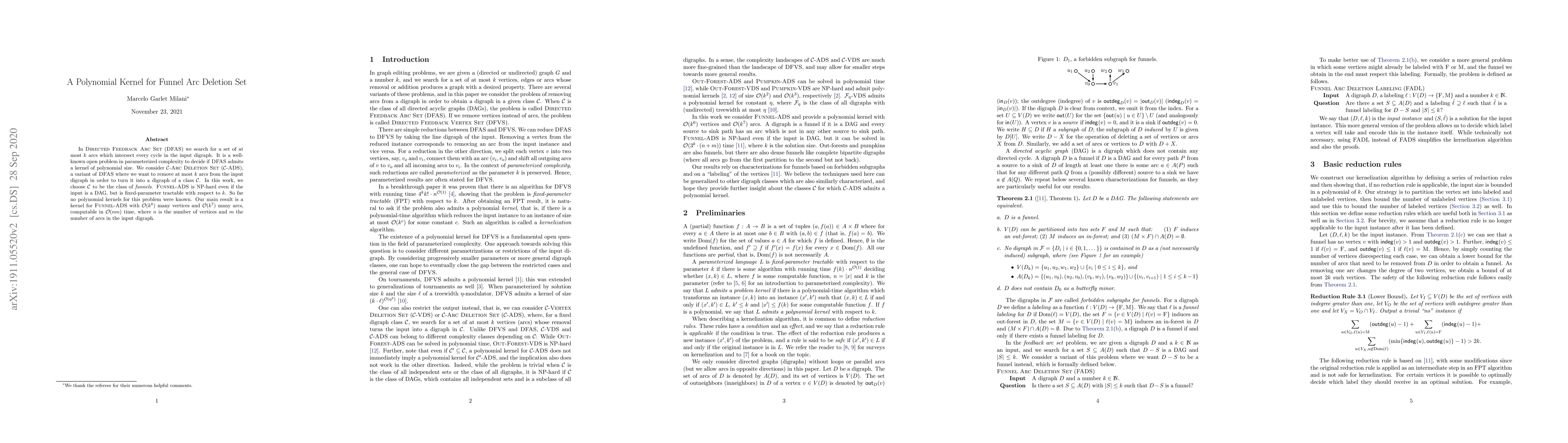 In Directed Feeback Arc Set (DFAS) we search for a set of at most $k$ arcs which intersect every cycle in the input digraph. It is a well-known open problem in parameterized complexity to decide if DFAS admits a kernel of polynomial size. We consider $\mathcal{C}$-Arc Deletion Set ($\mathcal{C}$-ADS), a variant of DFAS where we want to remove at most $k$ arcs from the input digraph in order to turn it into a digraph of a class $\mathcal{C}$. In this work, we choose $\mathcal{C}$ to be the class of funnels. Funnel-Arc Deletion Set is NP-hard even if the input is a DAG, but is fixed-parameter tractable with respect to $k$. So far no polynomial kernels for this problem were known. Our main result is a kernel for Funnel-Arc Deletion Set with $\mathcal{O}(k^6)$ many vertices and $\mathcal{O}(k^7)$ many arcs, computable in $\mathcal{O}(nm)$ time, where $n$ is the number of vertices and $m$ the number of arcs in the input digraph.