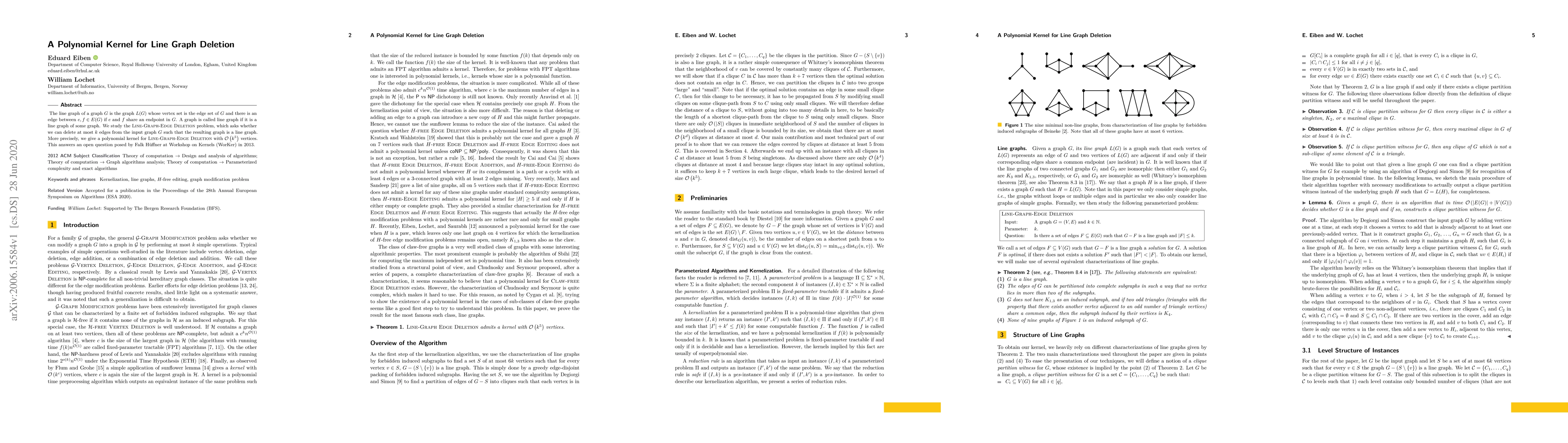 This paper presents a polynomial kernel with $\mathcal{O}(k^{5})$ vertices for the Line-Graph-Edge Deletion problem, addressing an open question from 2013 and providing an efficient solution to determine if at most $k$ edges can be deleted from a graph to make it a line graph.