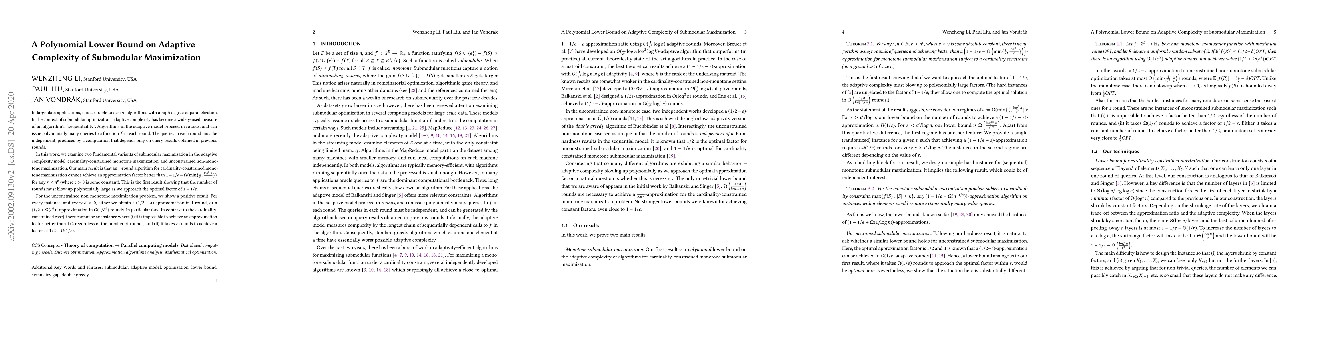 This paper establishes polynomial lower bounds on the adaptive complexity for two variants of submodular maximization: cardinality-constrained monotone maximization and unconstrained non-monotone maximization. It shows that achieving optimal approximation factors for the former requires exponentially increasing the number of rounds. In contrast, the latter can achieve near-optimal approximations in either one round or a few rounds, depending on the desired accuracy.