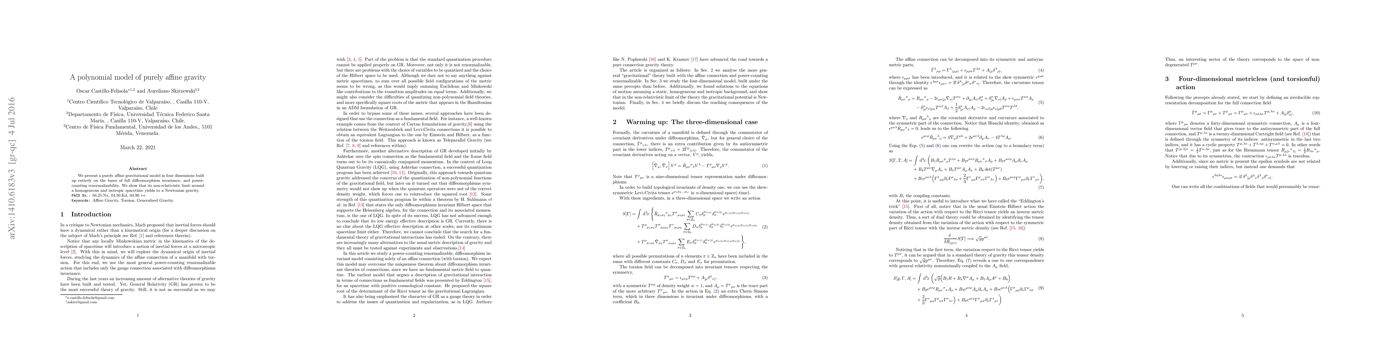 This paper proposes a purely affine gravitational model in four dimensions that maintains full diffeomorphism invariance and power-counting renormalizability. The model's non-relativistic limit demonstrates a transition to Newtonian gravity in a homogeneous and isotropic spacetime.