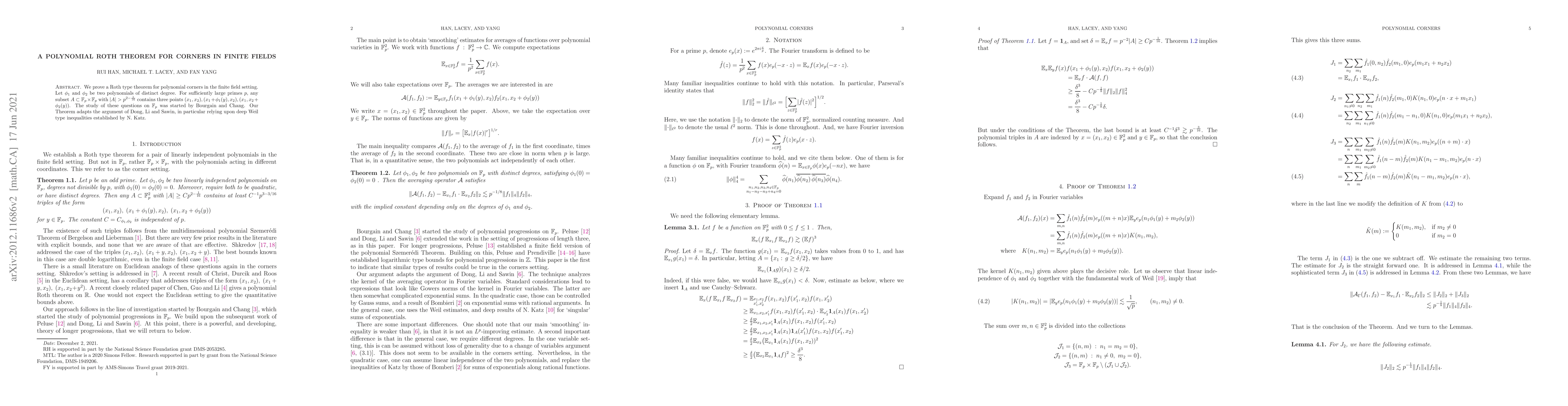 This paper proves a Roth theorem for polynomial corners in finite fields, showing that large subsets of $\mathbb F_p \times \mathbb F_p$ must contain specific three-point configurations defined by distinct degree polynomials. The result builds on prior work by Bourgain, Chang, and others, utilizing advanced inequalities from Katz.