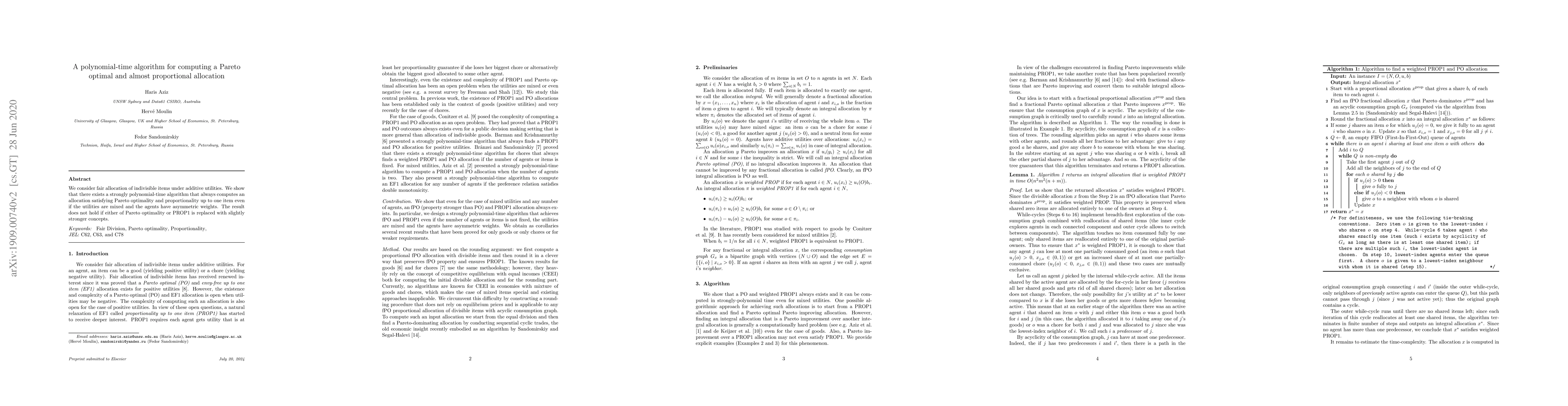 We consider fair allocation of indivisible items under additive utilities. When the utilities can be negative, the existence and complexity of an allocation that satisfies Pareto optimality and proportionality up to one item (PROP1) is an open problem. We show that there exists a strongly polynomial-time algorithm that always computes an allocation satisfying Pareto optimality and proportionality up to one item even if the utilities are mixed and the agents have asymmetric weights. We point out that the result does not hold if either of Pareto optimality or PROP1 is replaced with slightly stronger concepts.