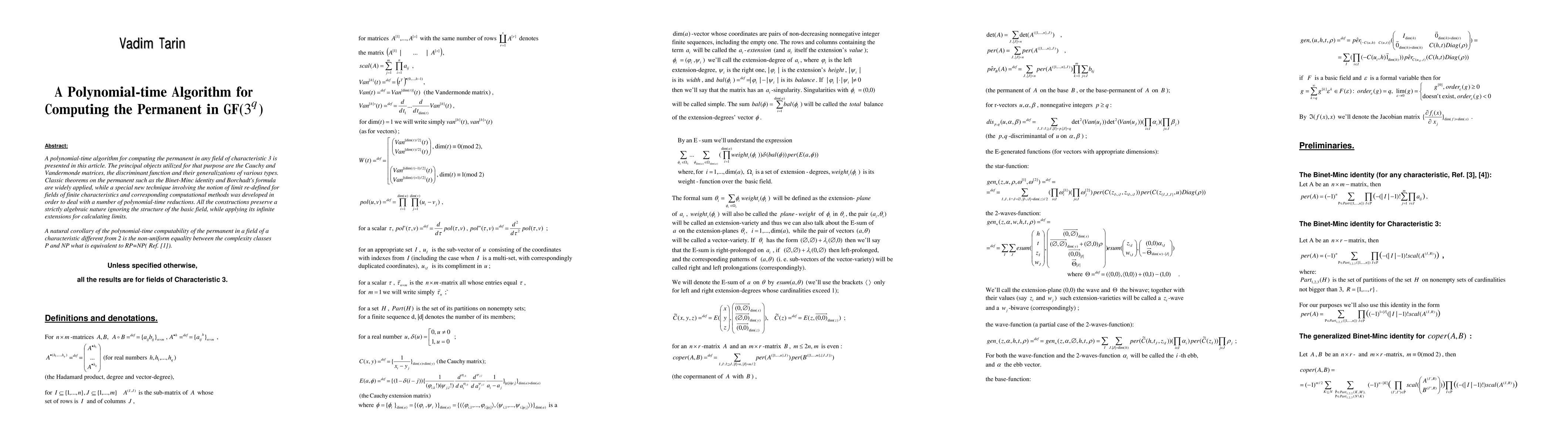 A polynomial-time algorithm for computing the permanent in any field of characteristic 3 is presented in this article. The principal objects utilized for that purpose are the Cauchy and Vandermonde matrices, the discriminant function and their generalizations of various types. Classical theorems on the permanent such as the Binet-Minc identity and Borchadt's formula are widely applied, while a special new technique involving the notion of limit re-defined for fields of finite characteristics and corresponding computational methods was developed in order to deal with a number of polynomial-time reductions. All the constructions preserve a strictly algebraic nature ignoring the structure of the basic field, while applying its infinite extensions for calculating limits. A natural corollary of the polynomial-time computability of the permanent in a field of a characteristic different from 2 is the non-uniform equality between the complexity classes P and NP what is equivalent to RP=NP (Ref. [1]).