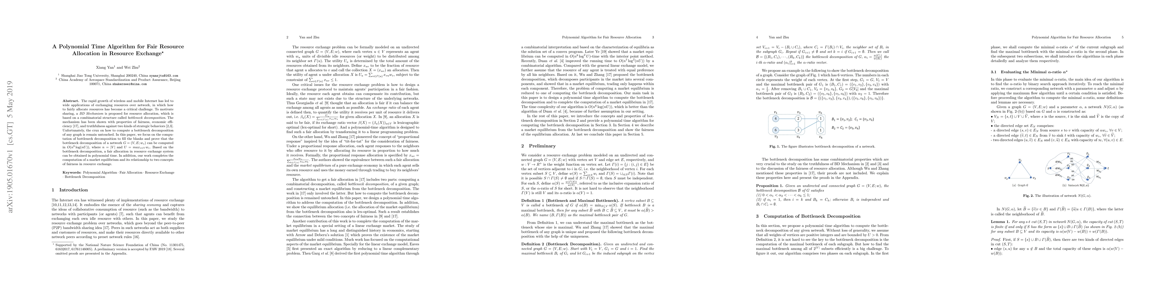 The rapid growth of wireless and mobile Internet has led to wide applications of exchanging resources over network, in which how to fairly allocate resources has become a critical challenge. To motivate sharing, a BD Mechanism is proposed for resource allocation, which is based on a combinatorial structure called bottleneck decomposition. The mechanism has been shown with properties of fairness, economic efficiency [17], and truthfulness against two kinds of strategic behaviors [2,3]. Unfortunately, the crux on how to compute a bottleneck decomposition of any graph is remain untouched. In this paper, we focus on the computation of bottleneck decomposition to fill the blanks and prove that the bottleneck decomposition of a network $G = (V, E; w_v)$ can be computed in $O(n^6 log(nU))$, where $n = |V|$ and $U = max_{v\in V} w_v$. Based on the bottleneck decomposition, a fair allocation in resource exchange system can be obtained in polynomial time. In addition, our work completes the computation of a market equilibrium and its relationship to two concepts of fairness in resource exchange.