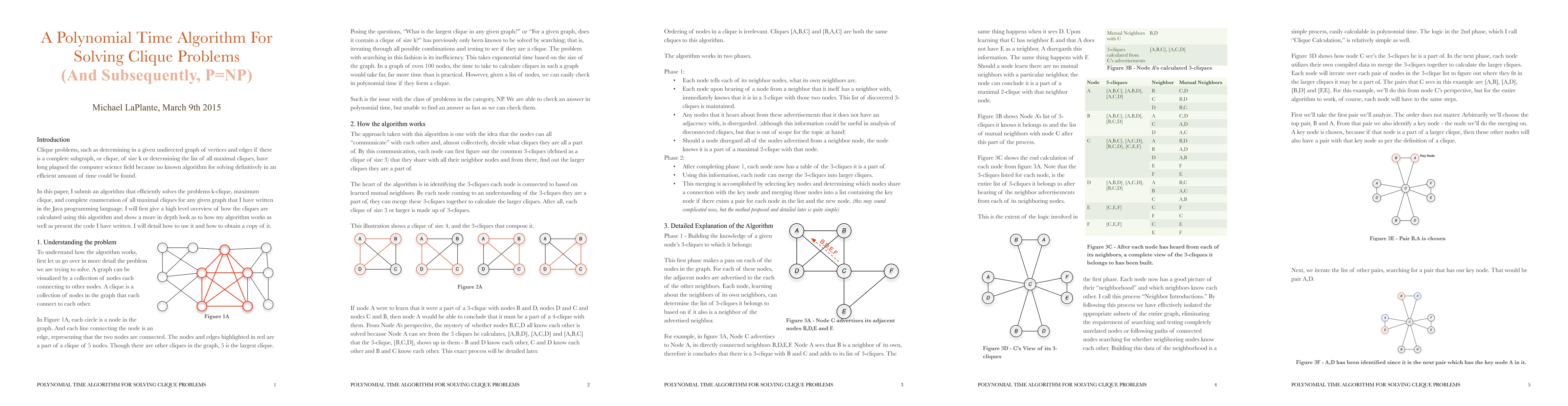 This paper introduces a polynomial time algorithm capable of solving various clique problems, including finding the largest clique, identifying all maximal cliques, and determining if a k-sized clique exists, suggesting a potential proof that P = NP.