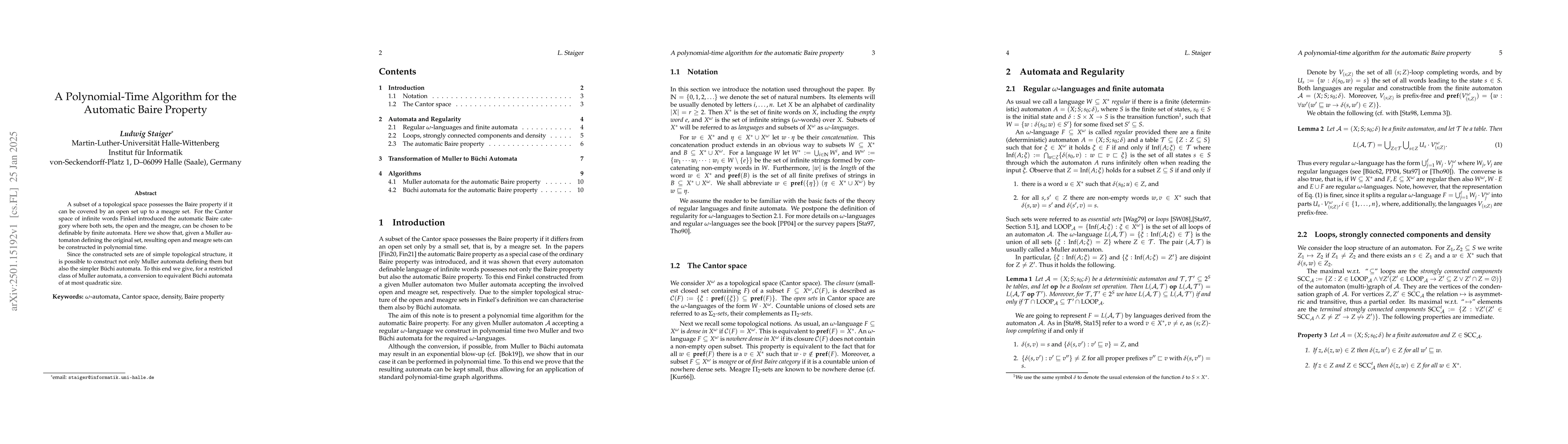 A subset of a topological space possesses the Baire property if it can be covered by an open set up to a meagre set. For the Cantor space of infinite words Finkel introduced the automatic Baire category where both sets, the open and the meagre, can be chosen to be definable by finite automata. Here we show that, given a Muller automaton defining the original set, resulting open and meagre sets can be constructed in polynomial time. Since the constructed sets are of simple topological structure, it is possible to construct not only Muller automata defining them but also the simpler B\"uchi automata. To this end we give, for a restricted class of Muller automata, a conversion to equivalent B\"uchi automata of at most quadratic size.