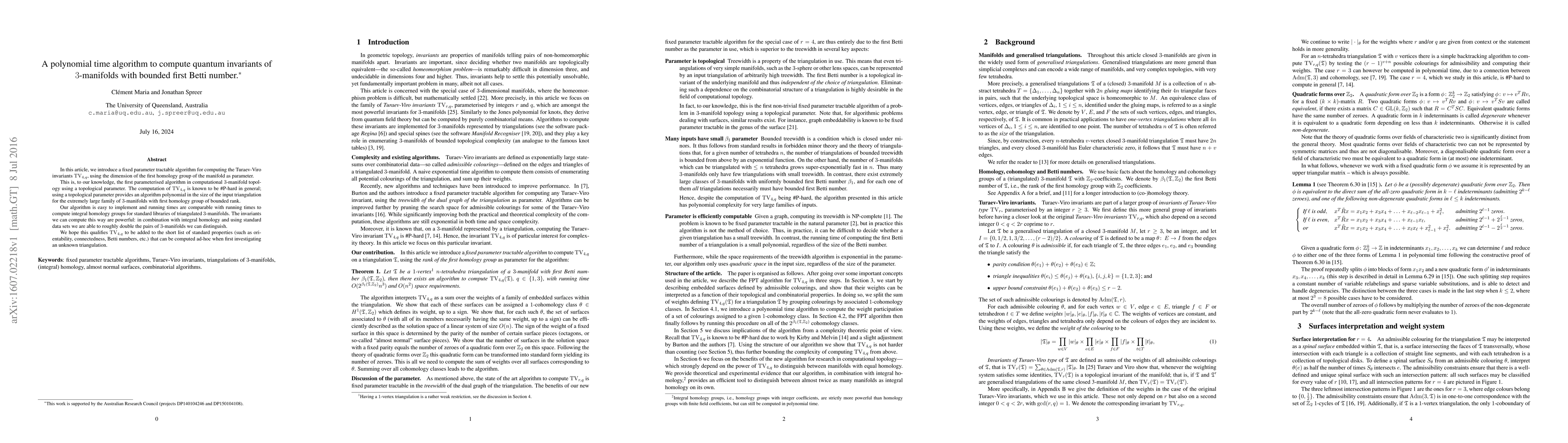 This paper introduces the first fixed parameter tractable algorithm for computing Turaev-Viro invariants TV(4,q) using the first homology group's dimension as a parameter, providing polynomial-time solutions for 3-manifolds with bounded first Betti number. The algorithm enhances the ability to distinguish 3-manifolds and may be included in standard computational properties for triangulations.