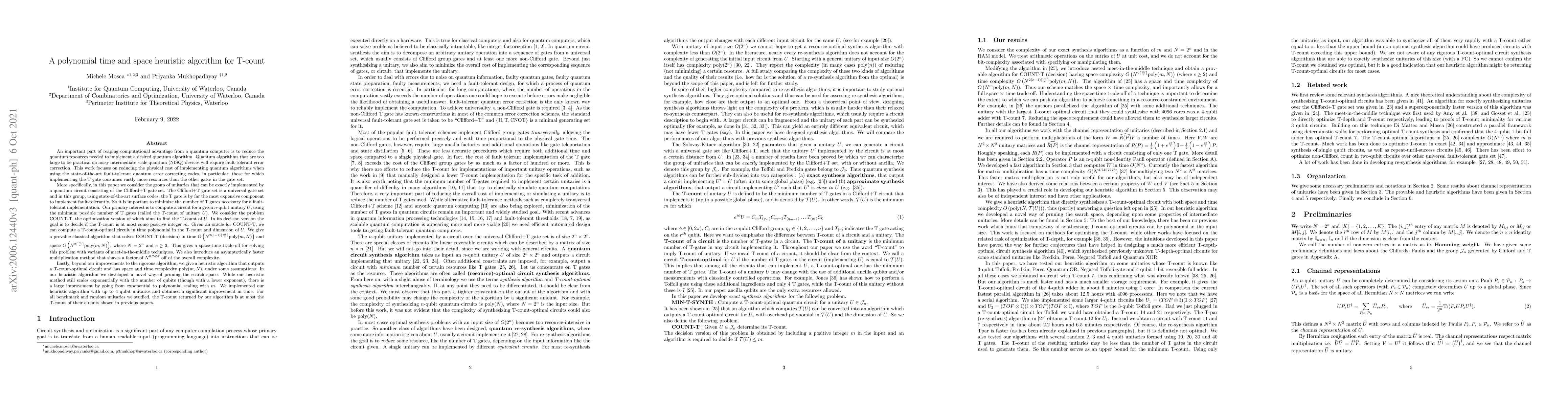 This paper presents a polynomial time and space heuristic algorithm to minimize the number of T gates (T-count) in quantum circuits implementing unitary operations using the Clifford+T gate set. It also introduces a rigorous classical algorithm with a space-time trade-off and an asymptotically faster multiplication method, while noting significant improvements over purely exponential scaling.