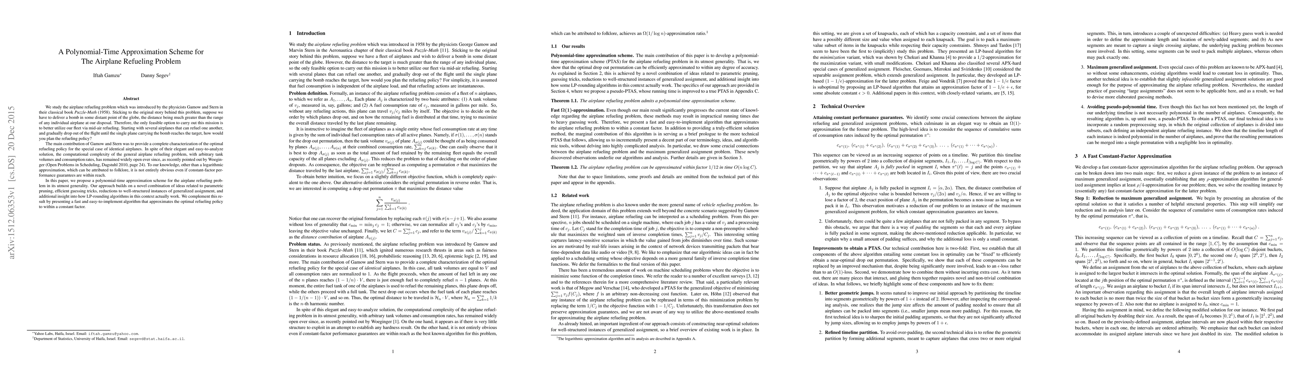 This paper presents a polynomial-time approximation scheme for the general airplane refueling problem, addressing the longstanding open problem of its computational complexity. The authors combine parametric pruning, efficient guessing, and LP-rounding techniques to achieve this, along with a practical algorithm that approximates the optimal refueling policy within a constant factor.