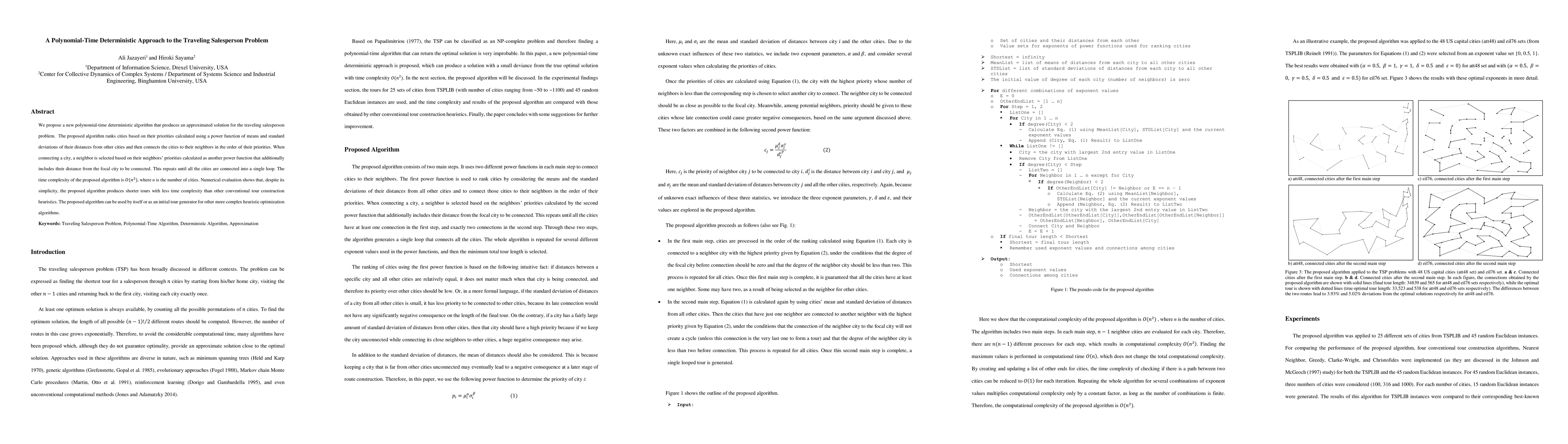 This paper introduces a new polynomial-time deterministic algorithm for the Traveling Salesperson Problem, which ranks cities based on priority and connects them in order to form a tour. The algorithm achieves $O(n^2)$ time complexity and outperforms conventional heuristics in tour length and efficiency.