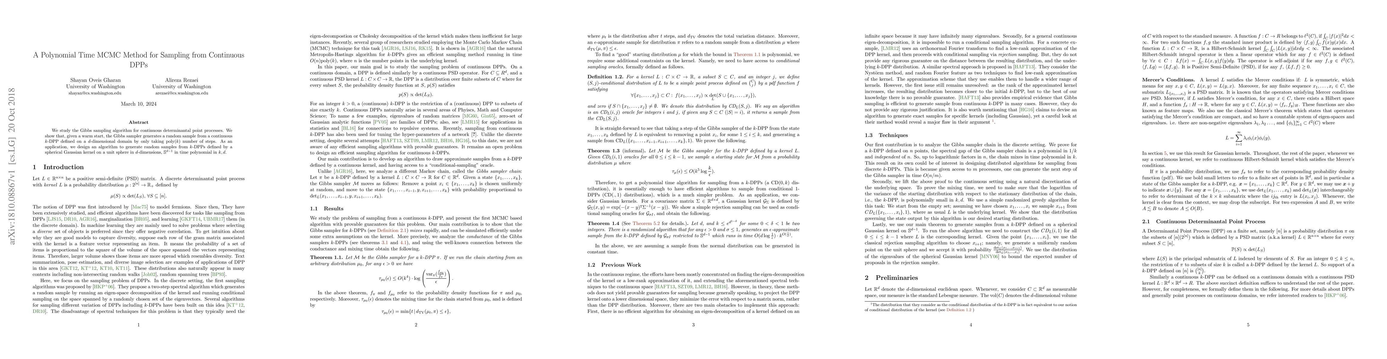 This paper presents a polynomial time MCMC method for sampling from continuous determinantal point processes (DPPs), demonstrating that the Gibbs sampler can generate samples in poly(k) steps given a warm start. The method is applied to generate samples from DPPs defined by a spherical Gaussian kernel on the unit sphere in d-dimensions in polynomial time in k and d.