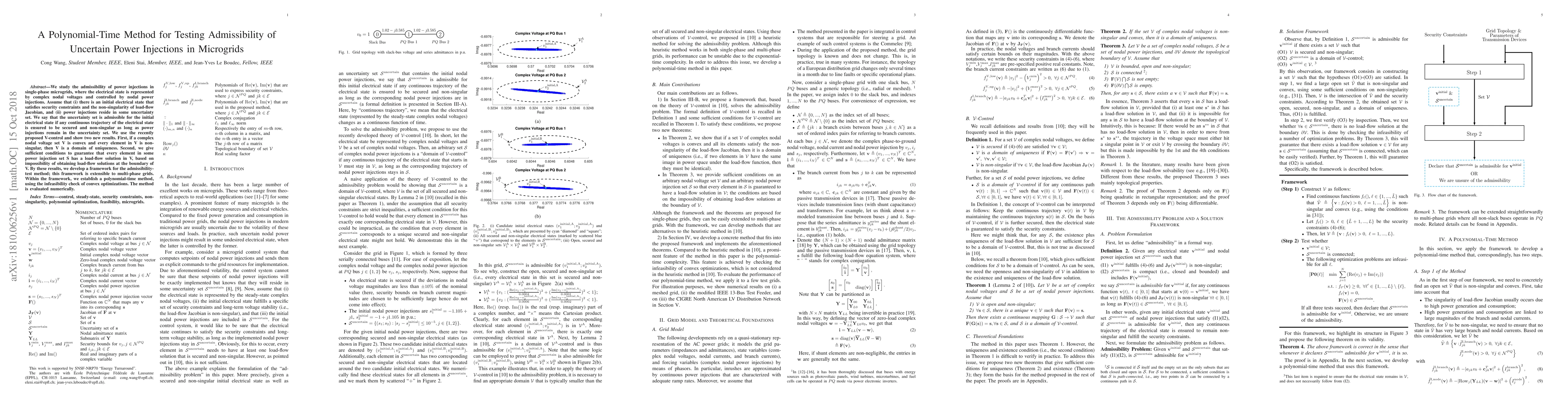 Researchers develop a polynomial-time method for testing admissibility of uncertain power injections in microgrids, ensuring the electrical state remains secure and non-singular within certain bounds.