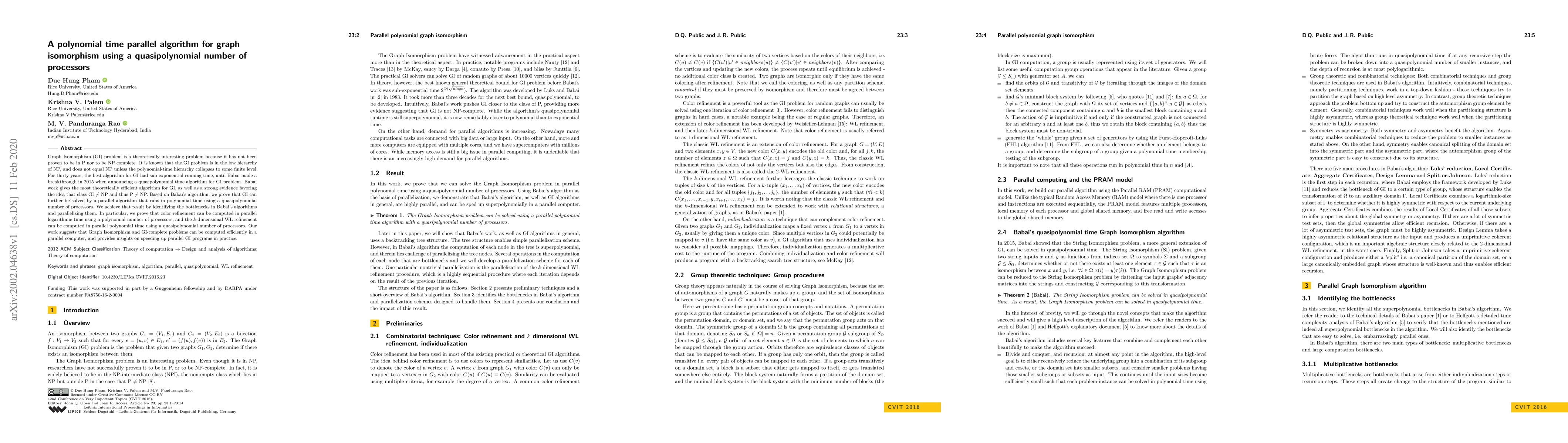 This paper presents a parallel algorithm for solving the Graph Isomorphism problem in polynomial time using a quasipolynomial number of processors, building on Babai's quasipolynomial time algorithm. It identifies and optimizes bottlenecks in Babai's method, demonstrating efficient parallel computation of color refinement and $k$-dimensional WL refinement.