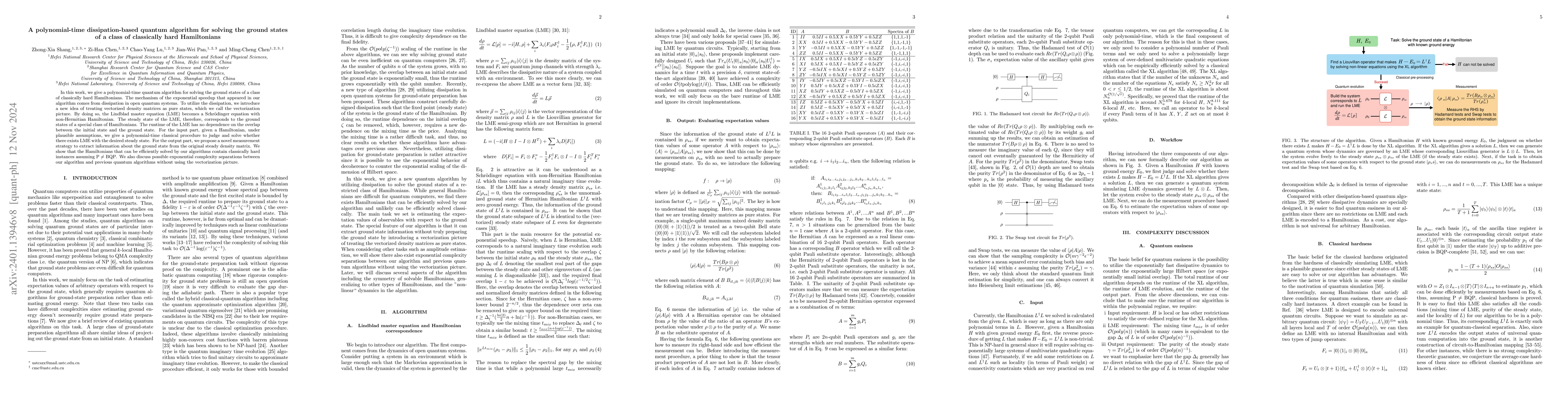This paper introduces a novel polynomial-time quantum algorithm for determining the ground states of classically hard Hamiltonians, achieving exponential speedup via a unique mapping using density matrices. The method employs the Lindblad master equation's steady state to represent the ground state, offering better complexity scaling compared to existing algorithms.