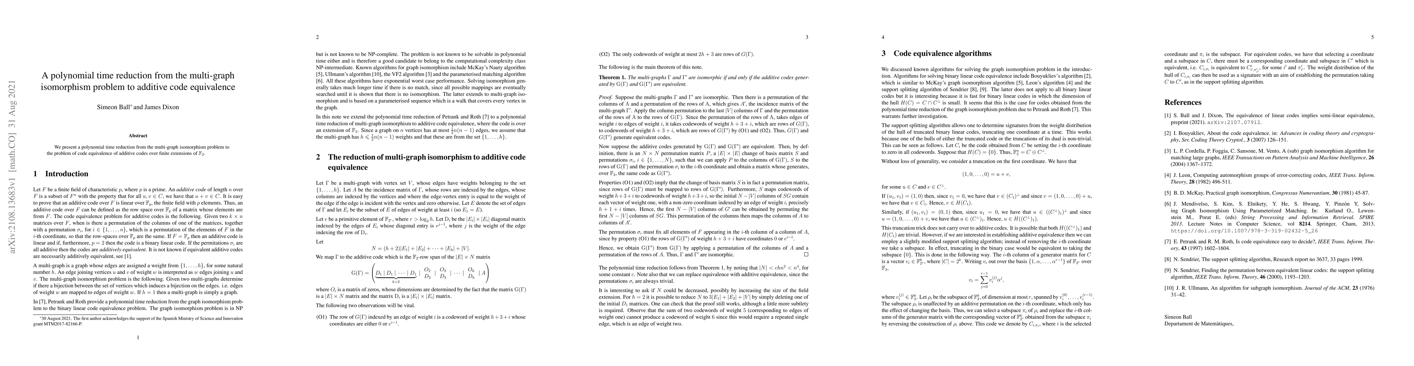 Summary: This paper demonstrates a polynomial time reduction from the multi-graph isomorphism problem to the additive code equivalence problem, establishing a connection between these two seemingly unrelated computational problems. The reduction provides insights into the complexity and potential solutions for both fields.