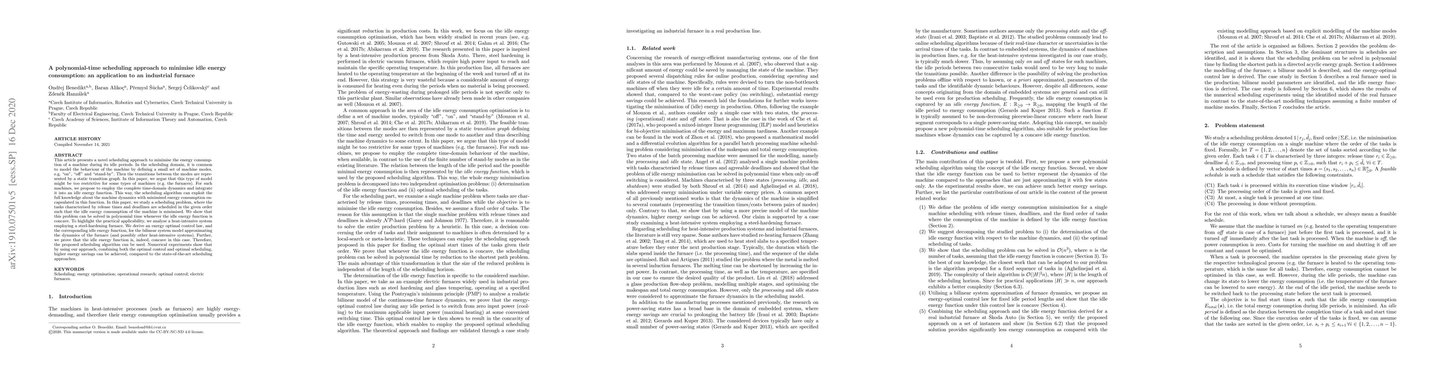 This article presents a novel scheduling approach to minimise the energy consumption of a machine during its idle periods. In the scheduling domain, it is common to model the behaviour of the machine by defining a small set of machine modes, e.g. "on", "off" and "stand-by". Then the transitions between the modes are represented by a static transition graph. In this paper, we argue that this type of model might be too restrictive for some types of machines (e.g. the furnaces). For such machines, we propose to employ the complete time-domain dynamics and integrate it into an idle energy function. This way, the scheduling algorithm can exploit the full knowledge about the machine dynamics with minimised energy consumption encapsulated in this function. In this paper, we study a scheduling problem, where the tasks characterised by release times and deadlines are scheduled in the given order such that the idle energy consumption of the machine is minimised. We show that this problem can be solved in polynomial time whenever the idle energy function is concave. To highlight the practical applicability, we analyse a heat-intensive system employing a steel-hardening furnace. We derive an energy optimal control law, and the corresponding idle energy function, for the bilinear system model approximating the dynamics of the furnace (and possibly other heat-intensive systems). Further, we prove that the idle energy function is, indeed, concave in this case. Therefore, the proposed scheduling algorithm can be used. Numerical experiments show that by using our approach, combining both the optimal control and optimal scheduling, higher energy savings can be achieved, compared to the state-of-the-art scheduling approaches.