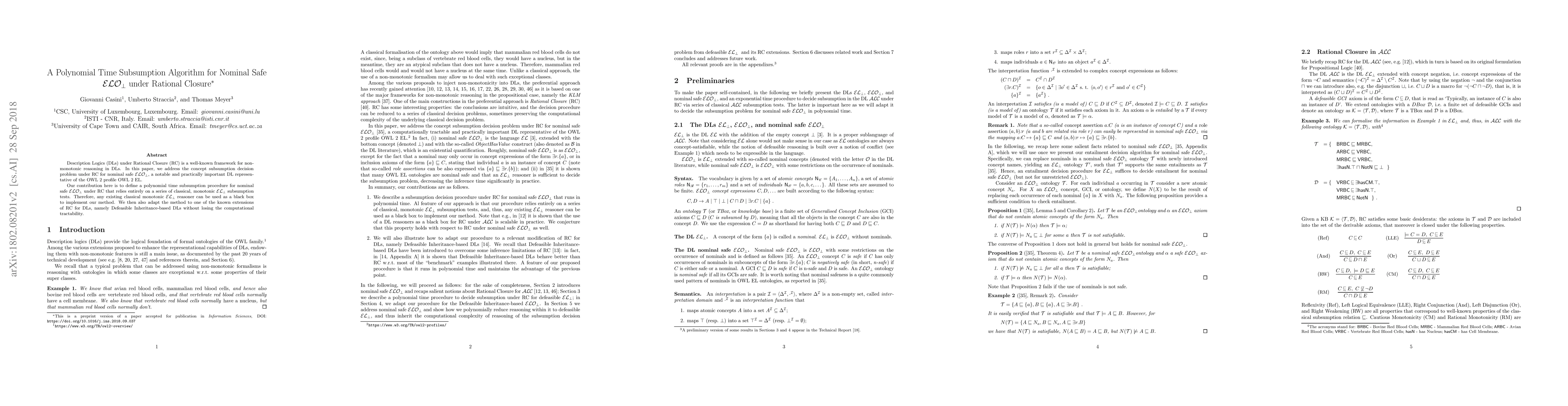 This paper presents a polynomial time subsumption algorithm for the nominal safe $\mathcal{ELO}_\bot$ under Rational Closure, utilizing classical monotonic $\mathcal{EL}_\bot$ subsumption tests. The method maintains computational efficiency and is adaptable to extensions like Defeasible Inheritance-based DLs.