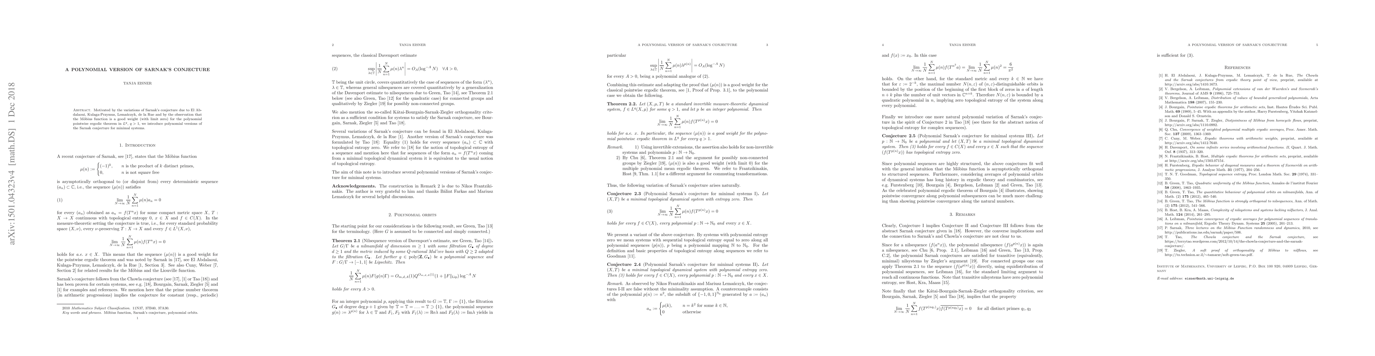 This paper proposes polynomial versions of Sarnak's conjecture for minimal systems, motivated by recent variations of the conjecture and the observation that the Möbius function serves as an effective weight in the polynomial pointwise ergodic theorem for $L^q$, $q>1$.