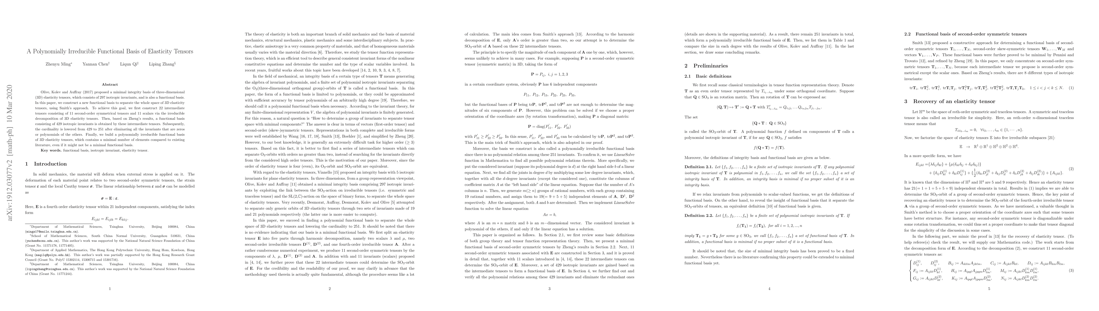 This paper proposes a novel method to construct a minimal functional basis for the elasticity tensor, reducing the number of isotropic invariants from 297 to 251 by utilizing 22 intermediate tensors and generating 429 isotropic invariants through irreducible decomposition.
