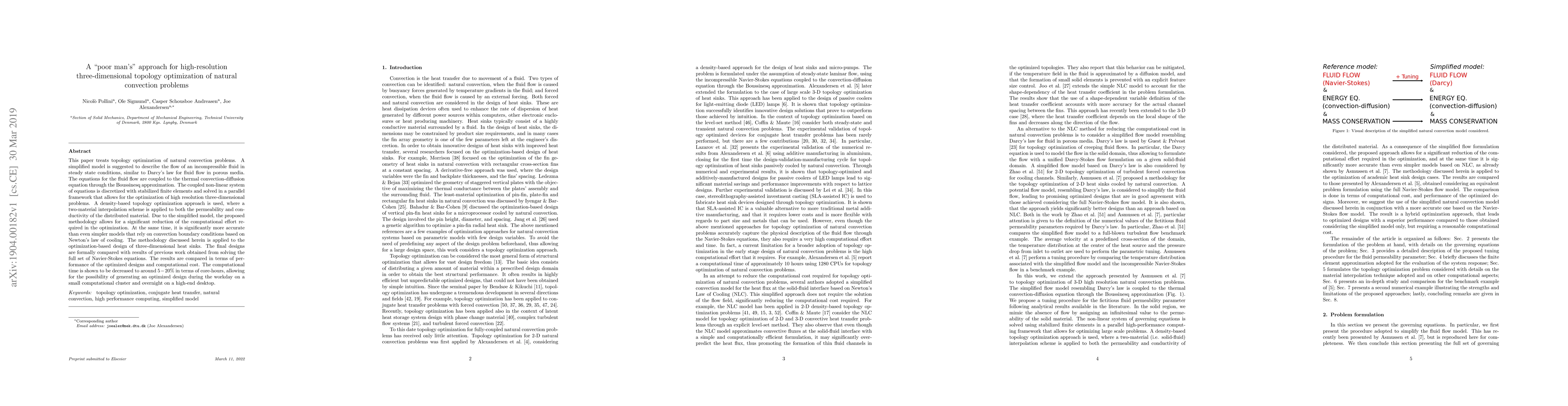 This paper proposes a simplified model for high-resolution 3D topology optimization of natural convection problems, significantly reducing computational effort while maintaining accuracy. The methodology is applied to optimize 3D heat sinks, showing a 5-20% reduction in computational time compared to full Navier-Stokes solutions.
