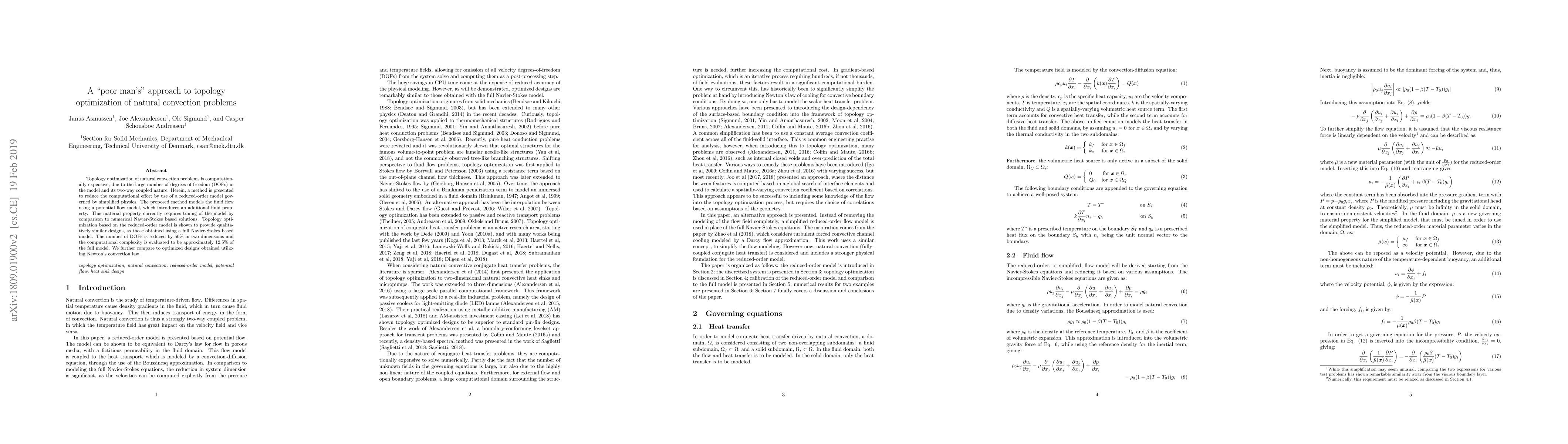 This paper proposes a "poor man's" reduced-order model for topology optimization of natural convection problems, using a potential flow model to halve the degrees of freedom and reduce computational effort to 12.5% of the full Navier-Stokes model, yielding qualitatively similar design results. The approach requires tuning based on comparison to full numerical solutions.